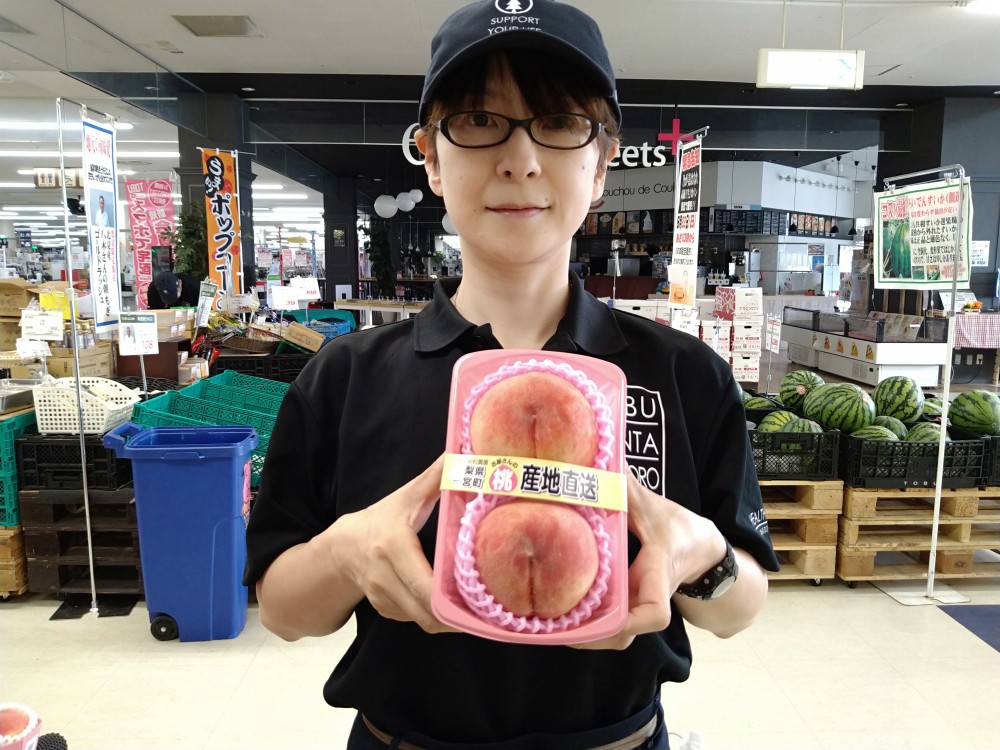 おはようございます。青果コーナーでは、山梨産古屋農園の桃(特大)1パック¥980で販売しております。古屋農園が低農薬にこだわって栽培しており、甘くみずみずしいおすすめの逸品です。