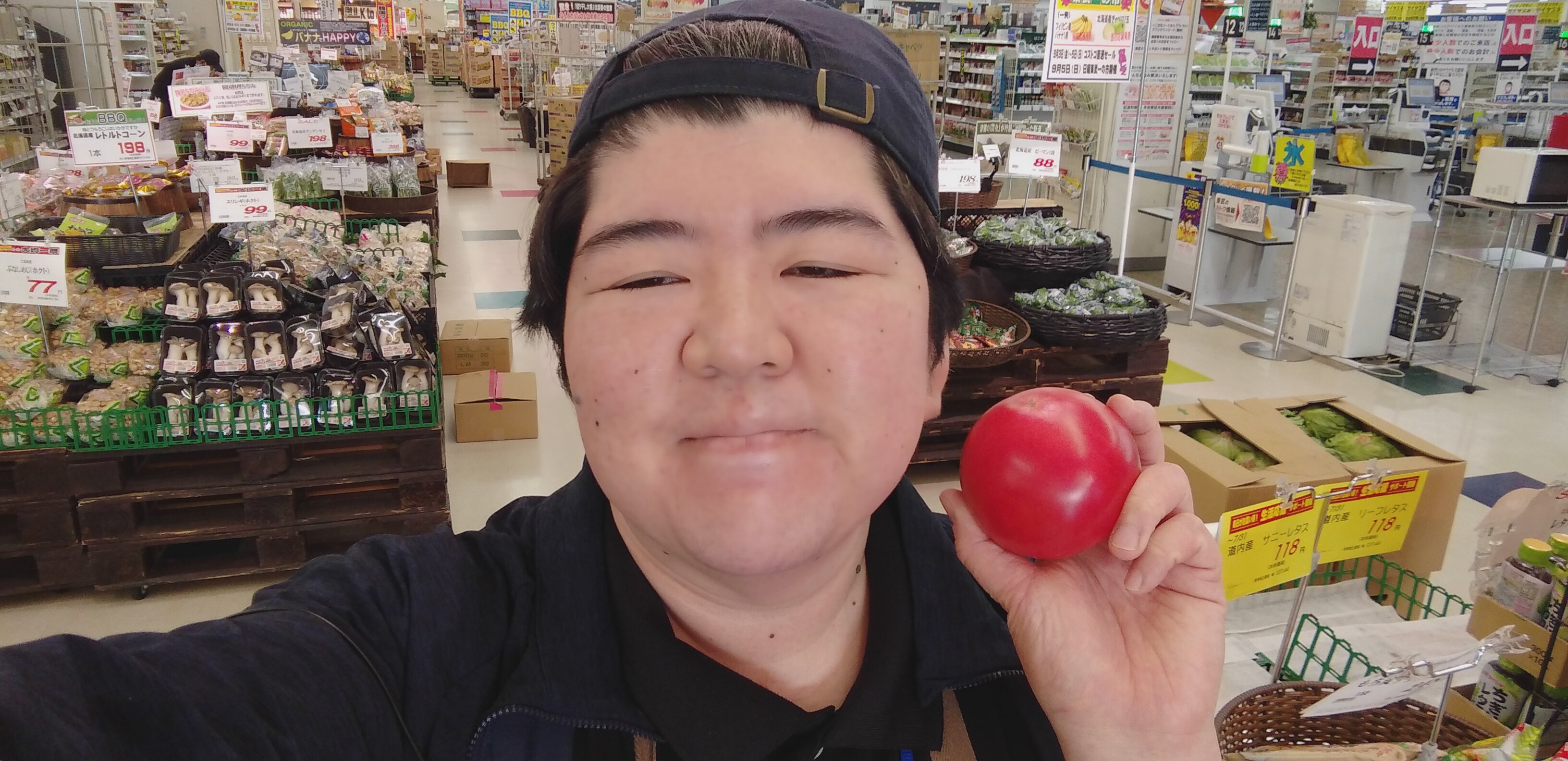 おはようございます。青果担当奥瀬です。本日のオススメは、北海道産のとまとです。1玉99円とお買い得です。サラダの彩に、各種料理にご利用ください。皆様の御来店をお待ちしております!