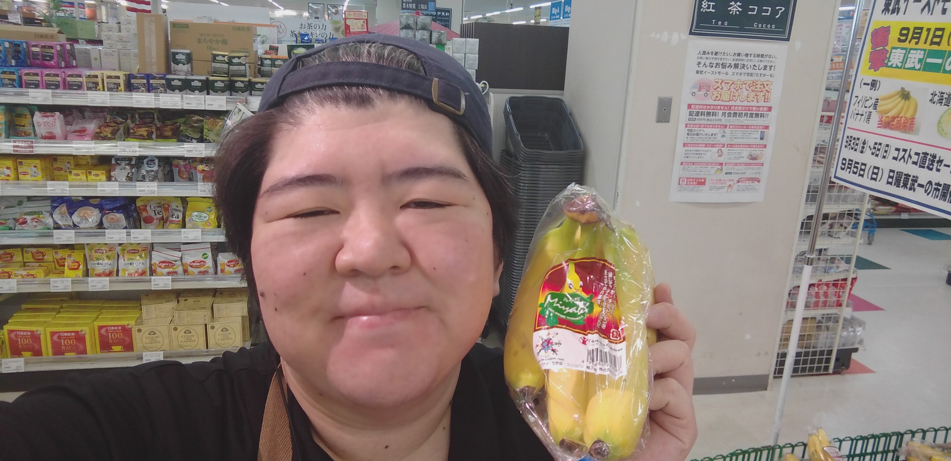 おはようございます。青果担当奥瀬です。本日はスーパー大均一祭です。青果コーナーからのオススメは、フィリピン産のみやびバナナです。1袋99円とお買い得です。小腹が空いた時のちょっとしたおやつにいかがでしょうか?ぜひご利用くださいませ。