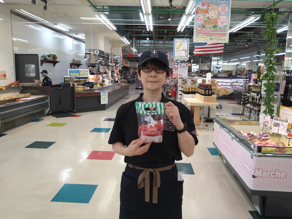 おはようございます。青果コーナーでは、美瑛産とまと1袋¥198で販売しております。中玉サイズの食べやすい大きさとなっております。どうぞお召し上がりください。
