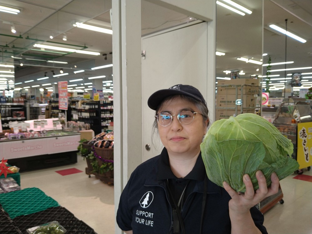 おはようございます。青果コーナーでは、北海道産きゃべつ1玉¥188で販売しております。鍋やお好み焼きにどうぞお召し上がりください。