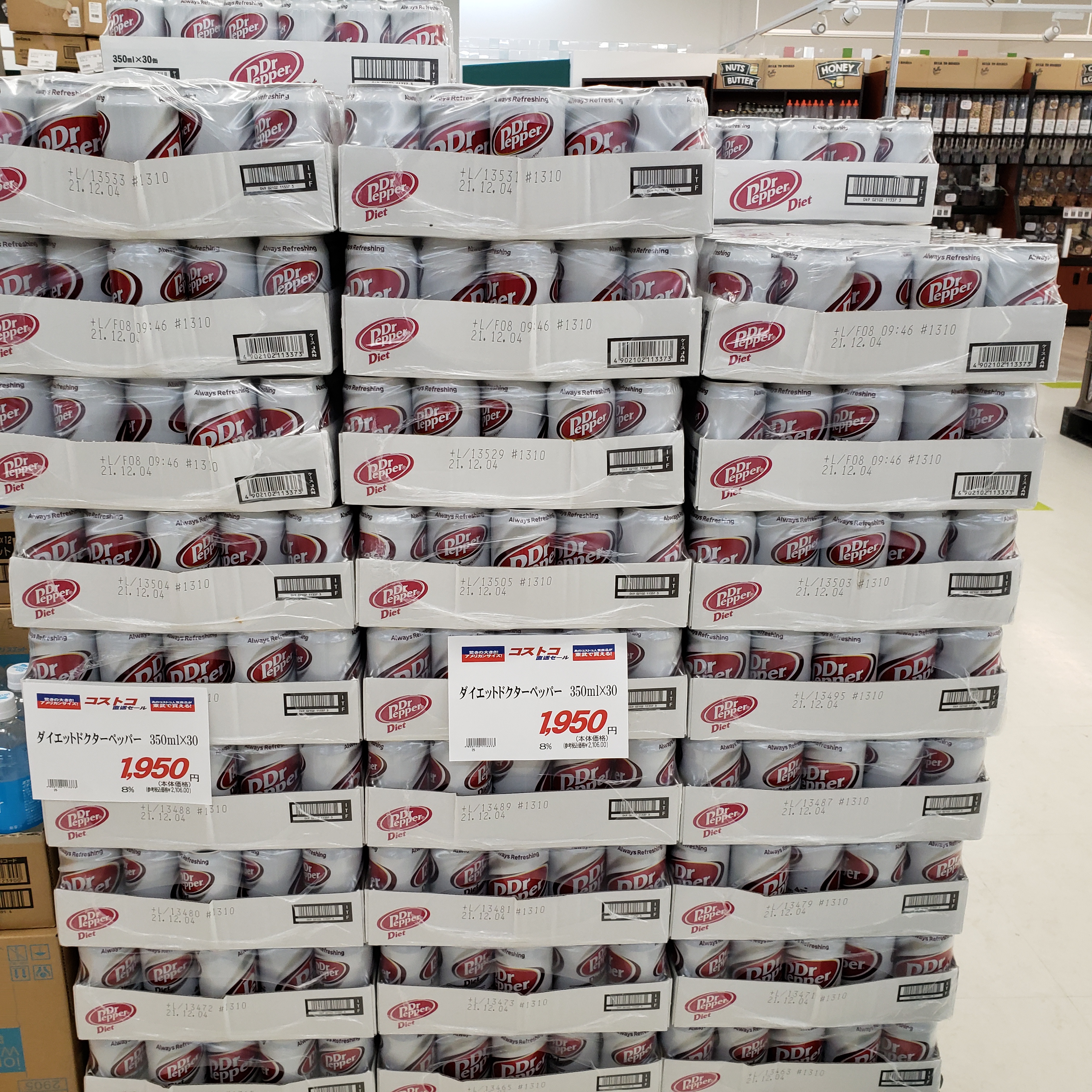 食品コーナーからは!本日コストコフェア!人気のダイエット ドクターペッパーです。20種類以上のフルーツフレーバー!価格は350mI×30缶入りで1950円です。是非お買い求めくださいませ。