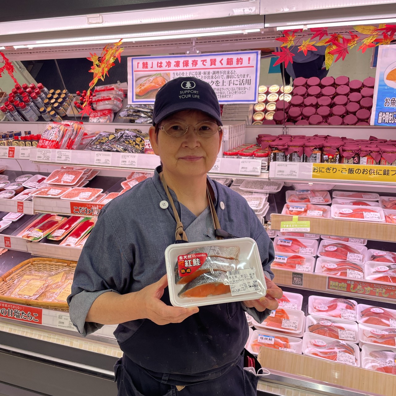 本日の鮮魚コーナーからのおすすめです。 紅鮭切り身100gあたり278円(税抜)となっております。弁当のおかずや、朝食にいかがですか。ぜひお買い求めください。