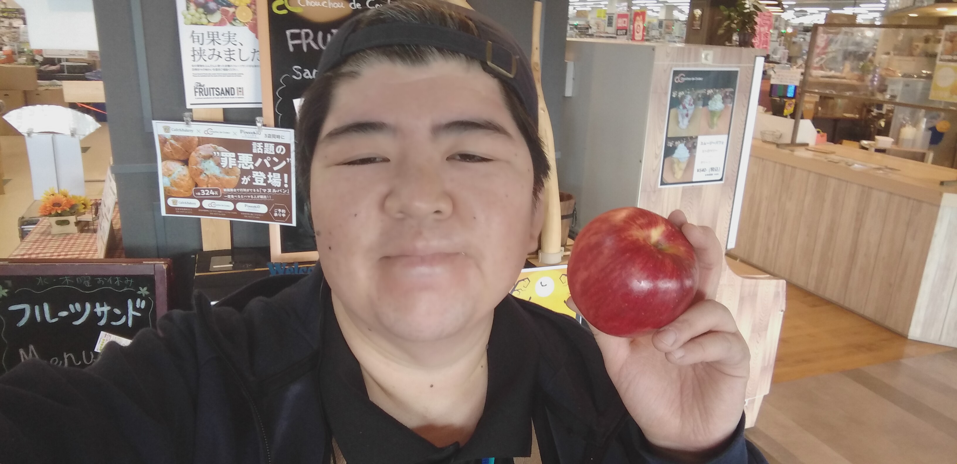 おはようございます。青果担当奥瀬です。本日の青果コーナーからのオススメは、青森、岩手産のりんごです。サンつがる、トキりんごなどが1玉99円とお買い得です。食物繊維やカリウムが多く含まれるりんご。ぜひご利用くださいませ。日曜一の市開催中ですので、この他にもお買い得な商品を多数取り揃えております。ぜひご利用くださいませ。