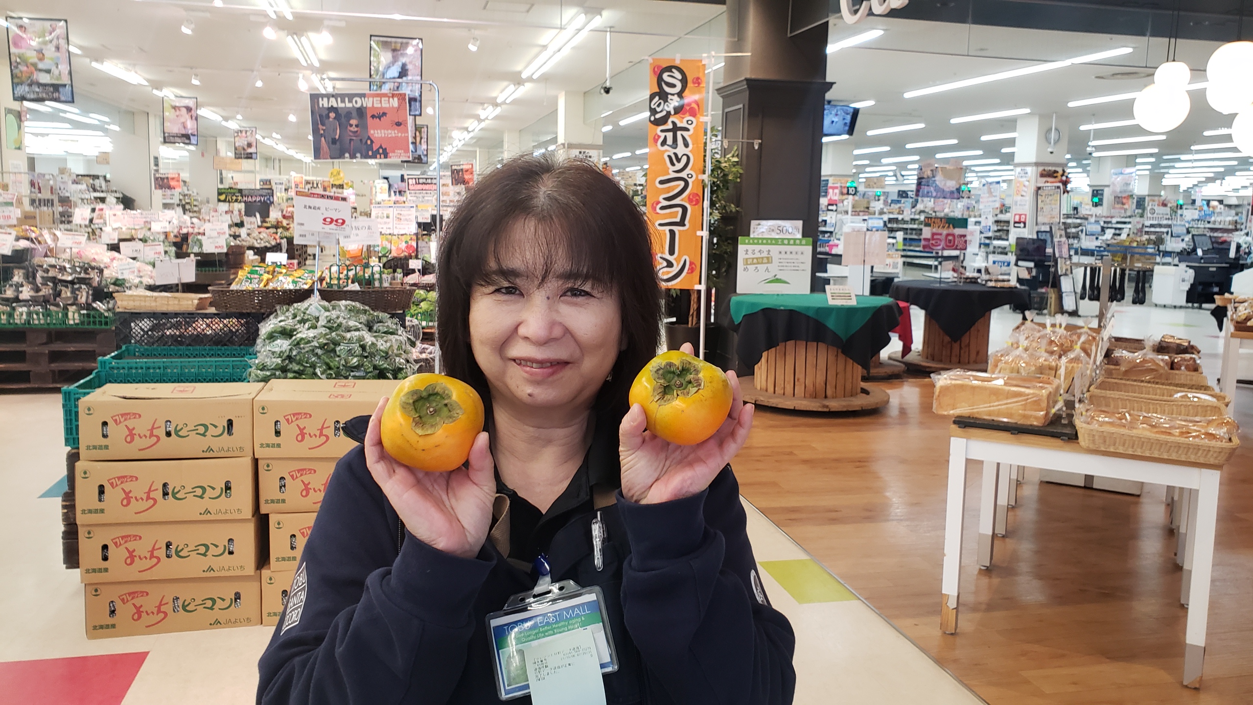 青果コーナーのおすすめ!和歌山産種無し柿がお買得です。1玉99円にて販売します。秋の味覚をぜひ!