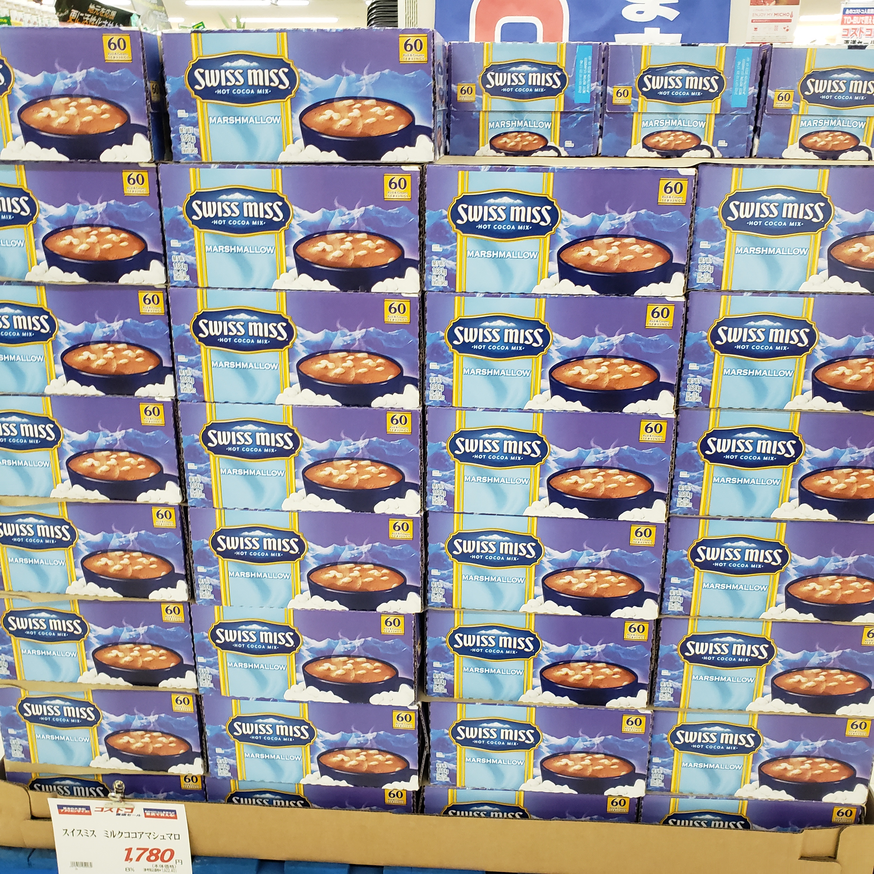 食品コーナーからは!本日コストコセール、コストコで人気のたっぶり、おやつにも、お菓子作りにも、 スイスミス ミルクココア マシュマロ 価格は28g×60袋入りで1780円です。是非お買い求めくださいませ。