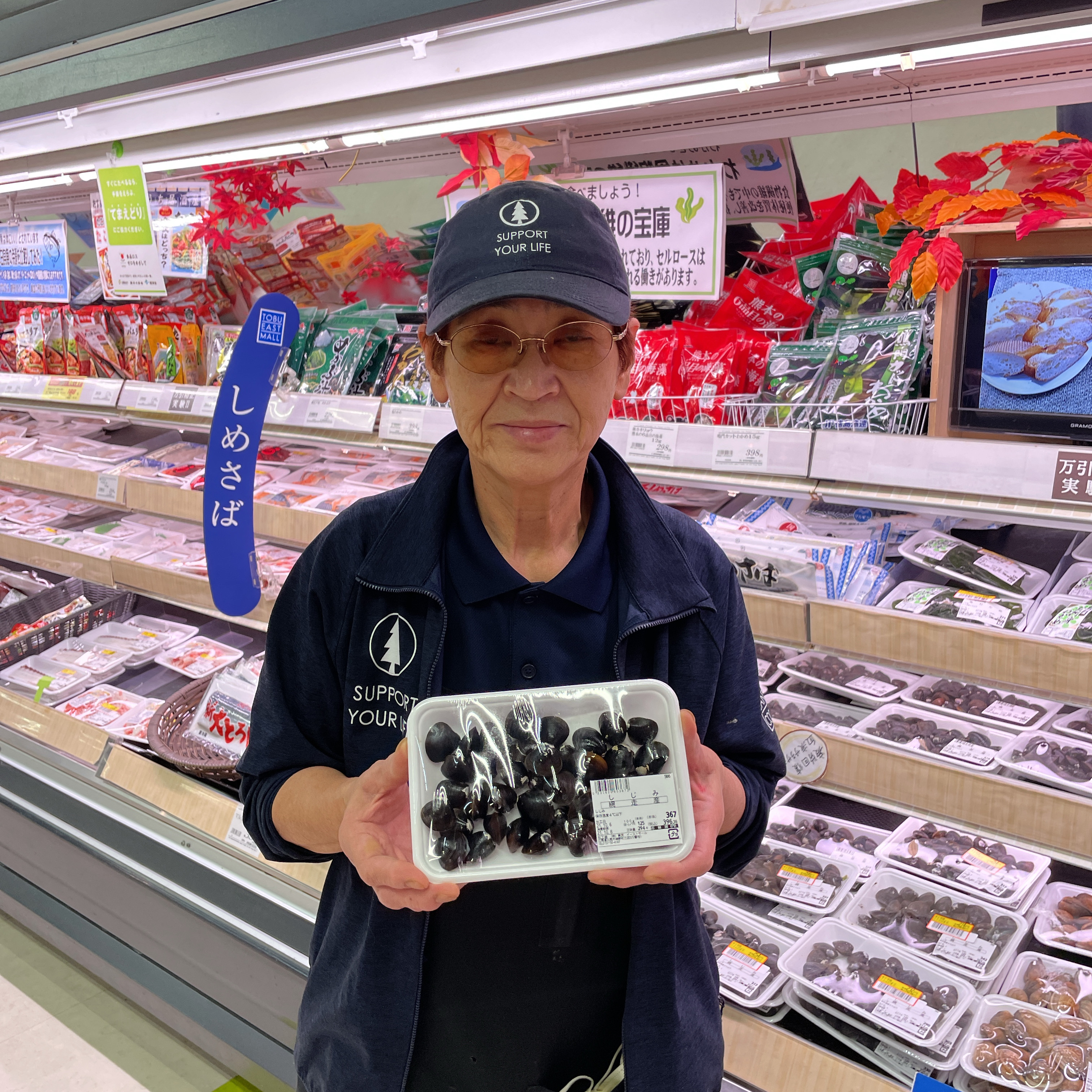 本日の鮮魚コーナーからのおすすめです。しじみが100g125円(税込)となっております。疲れた体においいしいお味噌汁いかがですか。是非ご利用ください。