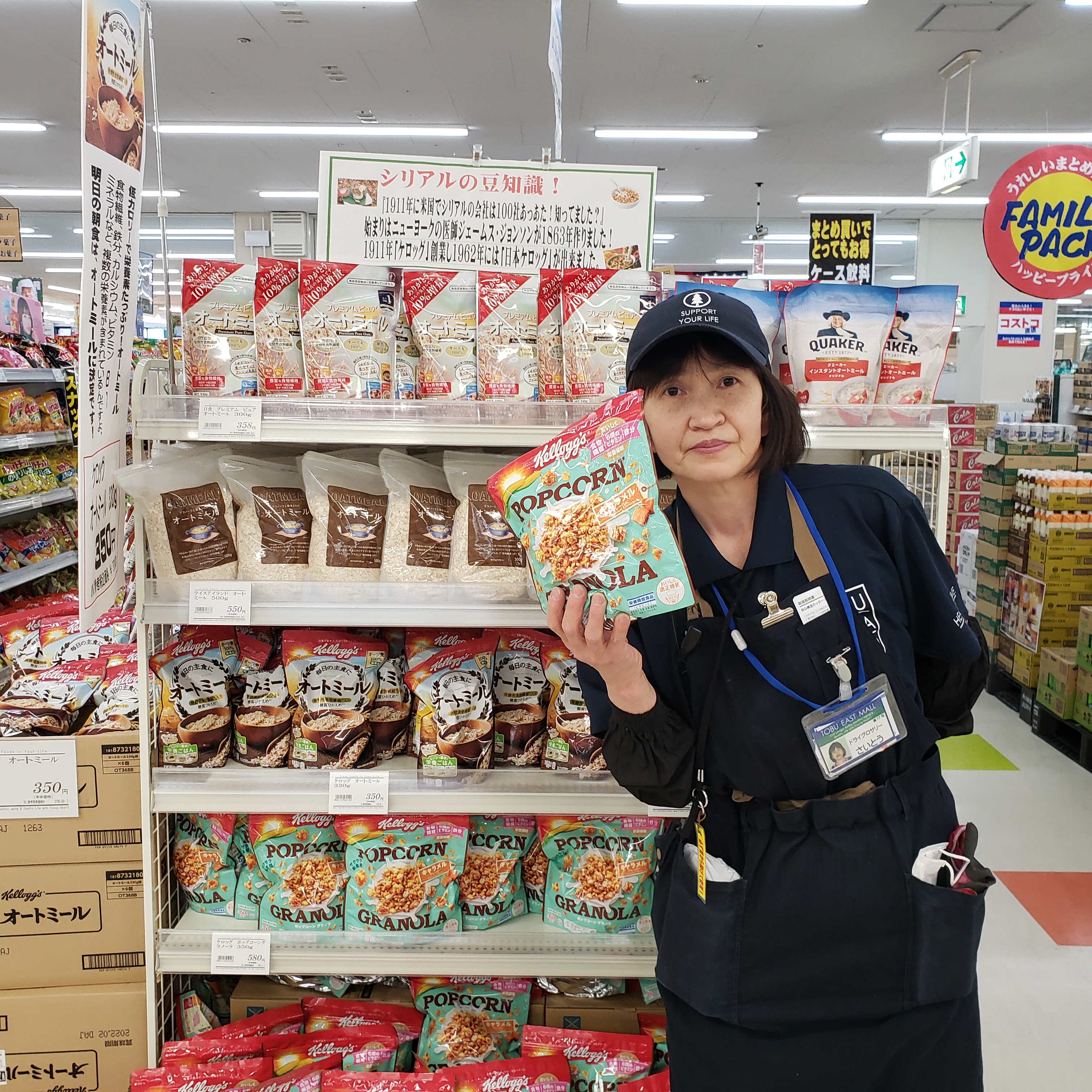 食品コーナーからは!ケロッグ ポップコーングラノラ キャラメルフレーバーです。 食物繊維、6種のビタミン、鉄分が入って栄養バランス満点、価格は350g入りで580円です。是非お買い求めくださいませ。