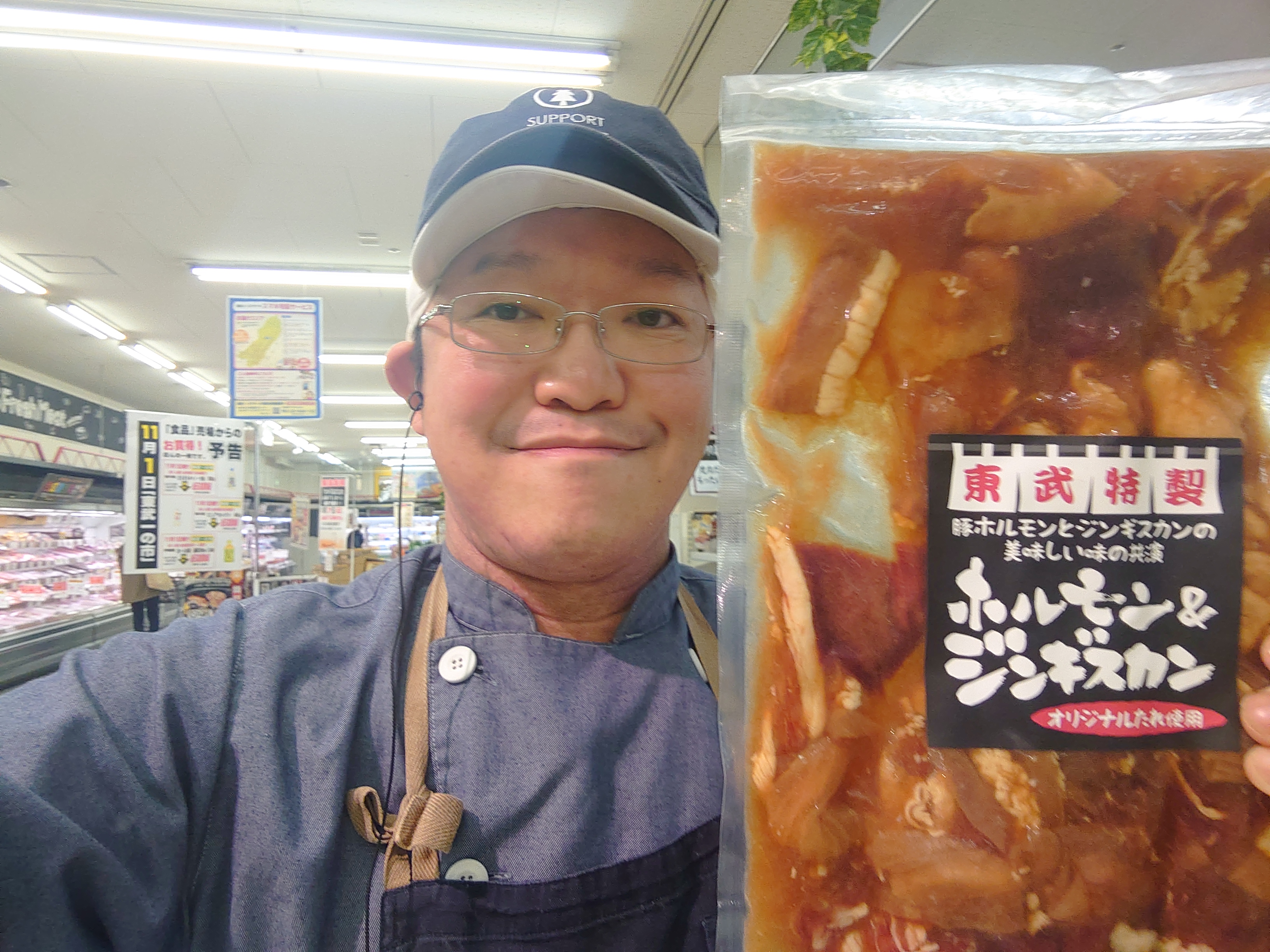 おはようございます。ミート担当近藤です。豚ホルモンとジンギスカンの美味しい味の競演でオリジナルたれを使用しています。東武でしか販売していないオリジナル商品です。