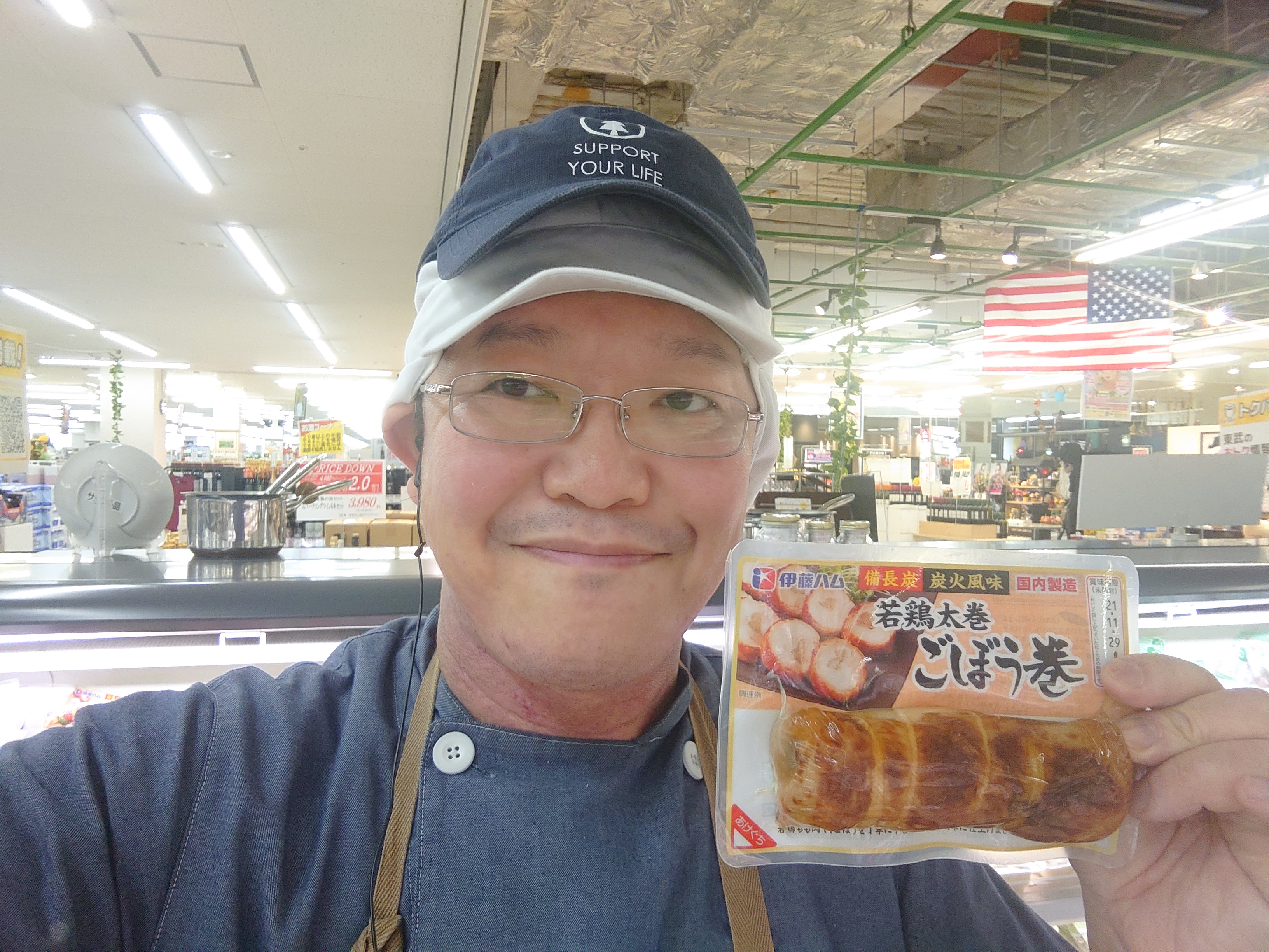 おはようございます。ミート担当近藤です。若鶏モモ肉で、ごぼうを丁寧に手巻きし、炭火風味に仕上げました。