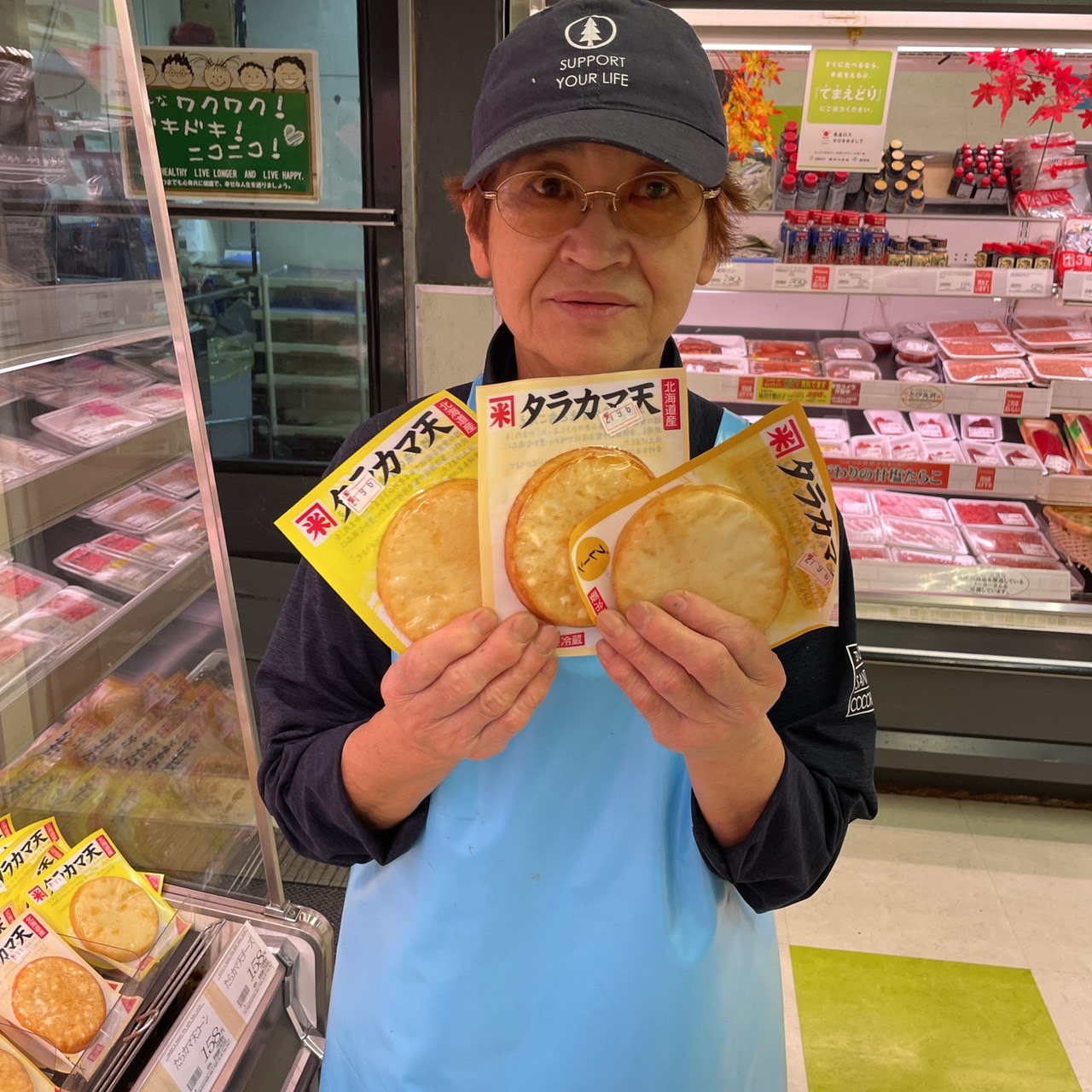 本日の鮮魚コーナーからおすすめです。 たらかま天プレーン・チーズ・コーン・野菜の4種類が一枚158円(税抜)となっております。 また大均一祭開催中です。是非ご来店ご利用お待ちしております。