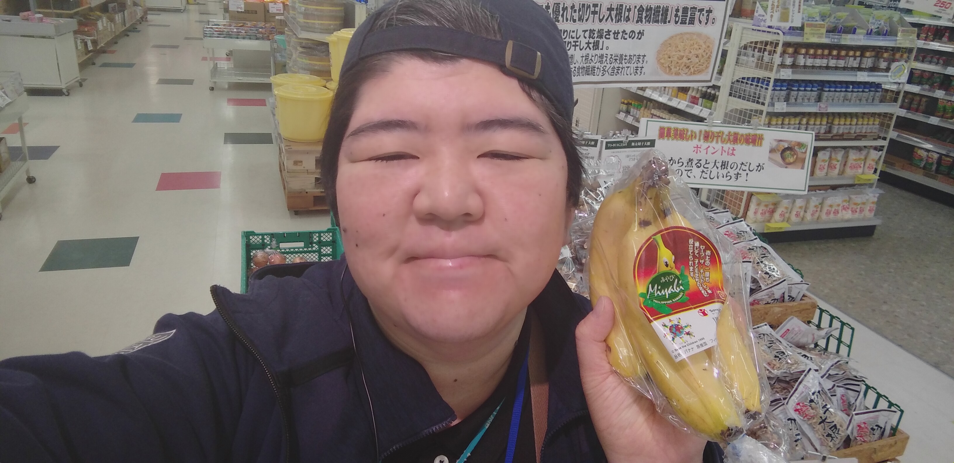 おはようございます。青果担当奥瀬です。本日もスーパー大均一祭開催中です。本日のオススメは、フィリピン産のみやびバナナです。1袋99円とお買い得です。ちょっとしたおやつにいかがでしょうか。是非ご利用くださいませ。この他にも均一価格でお買い得商品を多数取り揃えております。皆様のご来店をお待ちしております。