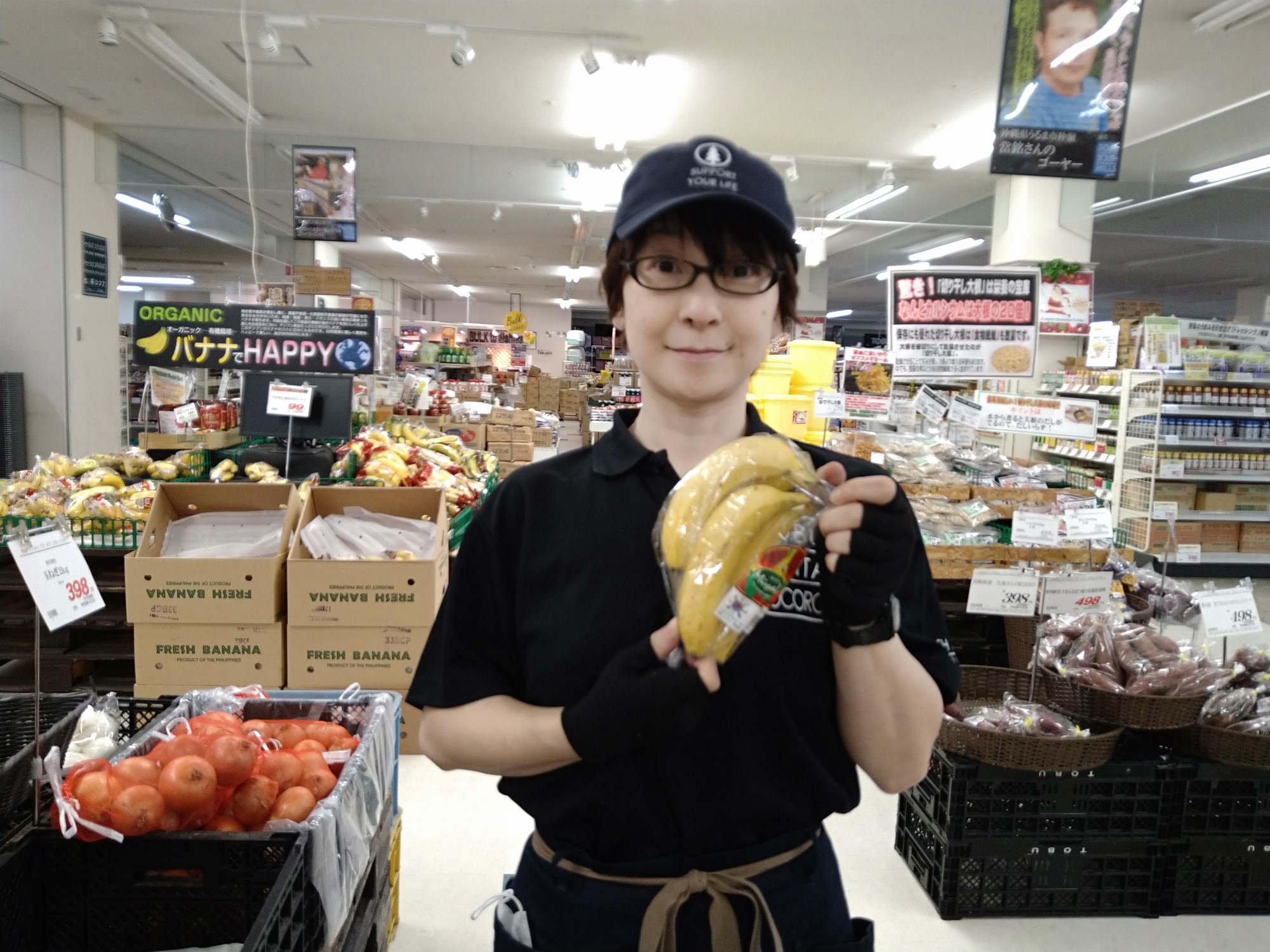 おはようございます。青果コーナーでは、フィリピン産みやびバナナ1袋99円(本体価格)にて販売しております。少し小さめサイズなので、子供でも食べやすい大きさとなっております。どうぞ御賞味ください。