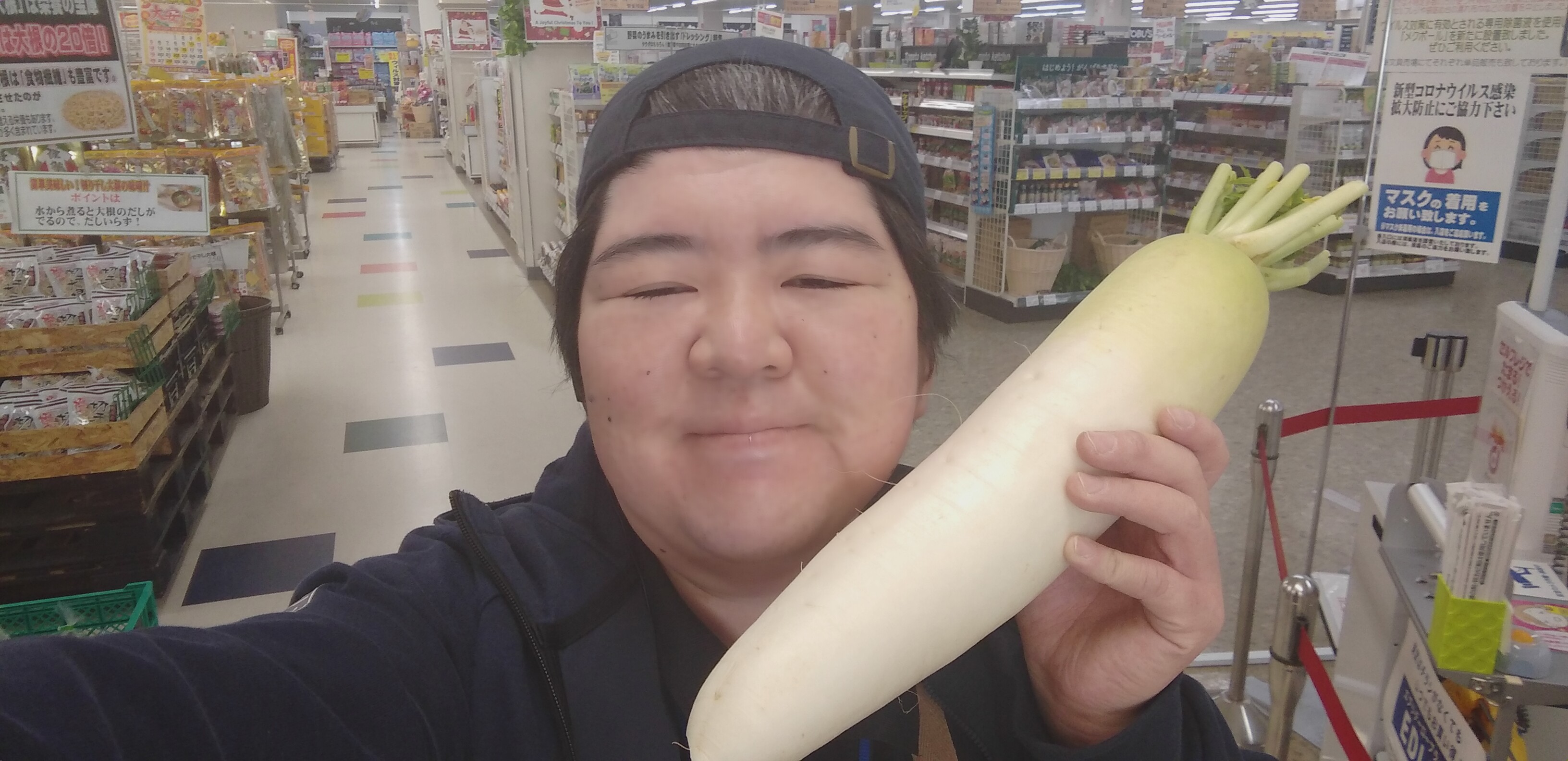 おはようございます。青果担当奥瀬です。本日、スーパー大均一祭最終日です。本日のオススメは、青森産のだいこんです。1本99円とお買い得です。煮物、汁物、サラダ等にいかがでしょうか。皆様のお越しをお待ちしております。