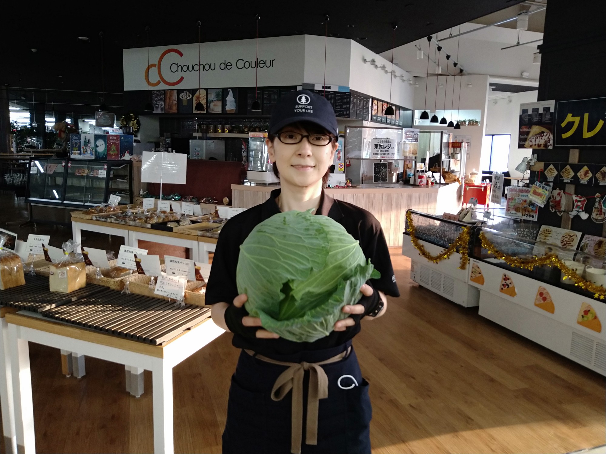 おはようございます。青果コーナーでは、茨城産大玉きゃべつ1玉99円(本体価格)にて販売しております。大玉なので食べごたえがあり、大変お安くなっております。どうぞ御賞味ください。