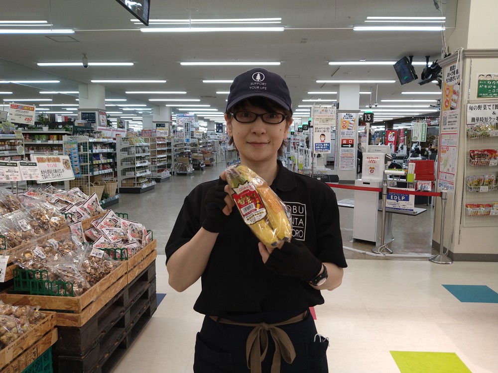 おはようございます。青果コーナーでは、甘熟王バナナ1袋185円(本体価格)にて販売しております。甘く食べやすい、血圧が高めの方でも美味しくいただけます。