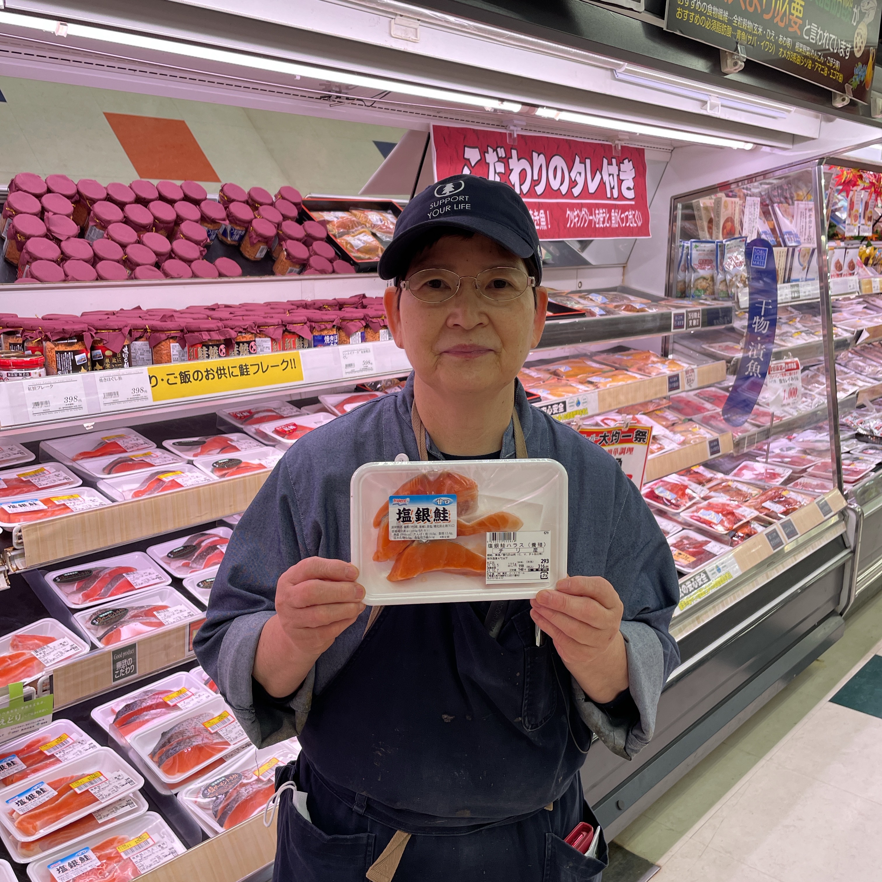 本日の鮮魚コーナーからのおすすめです。 銀鮭ハラミが100g258円となっております。 大均一祭開催中ですので是非ご来店ご利用お待ちしております。