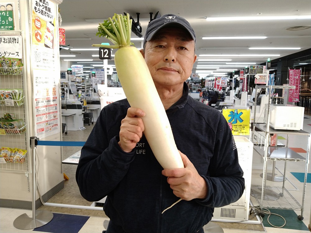 おはようございます。青果コーナーでは、千葉産大根1本99円(本体価格)にて販売しております。鍋物やおでんなど味がしみた大根は格別です。美味しくお召し上がりください。
