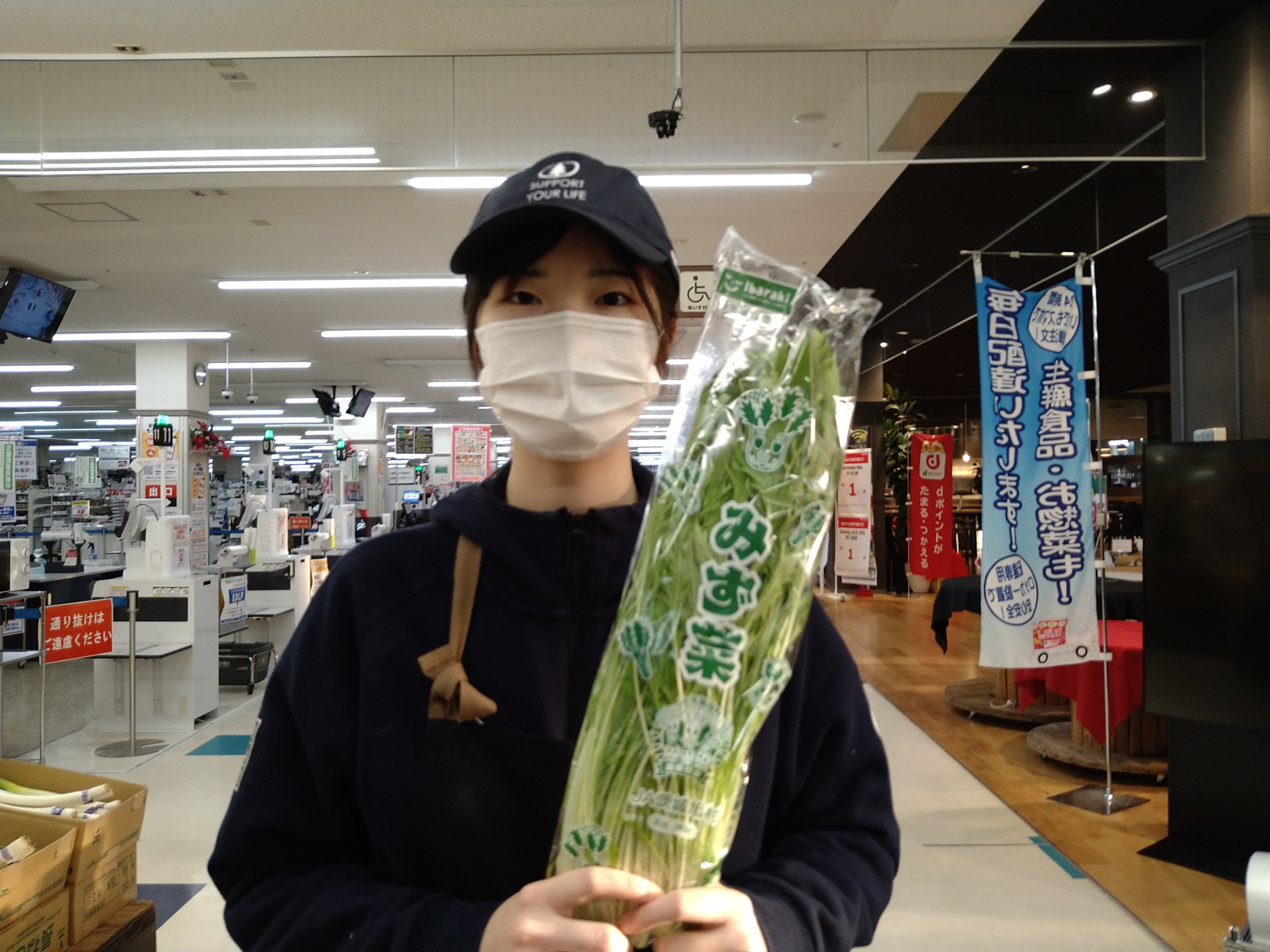 おはようございます。青果コーナーでは、茨城産水菜1袋99円(本体価格)にて販売しております。鍋物やサラダなどにいかがでしょうか?