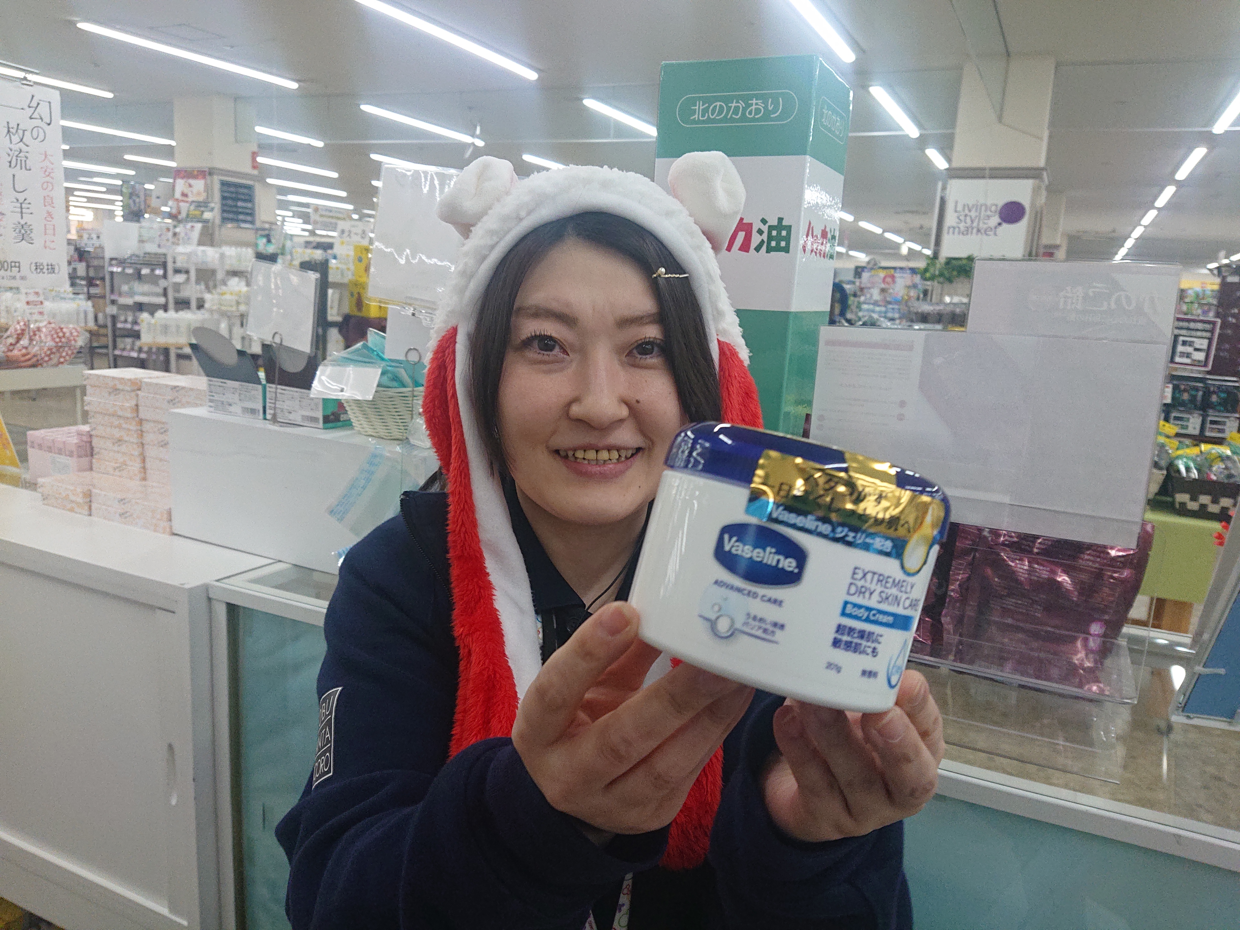 おはようございます。家庭消耗品担当小西です。本日のおすすめ商品は、バセリンボディクリームです。乾燥しがちなお肌もしっとりします。