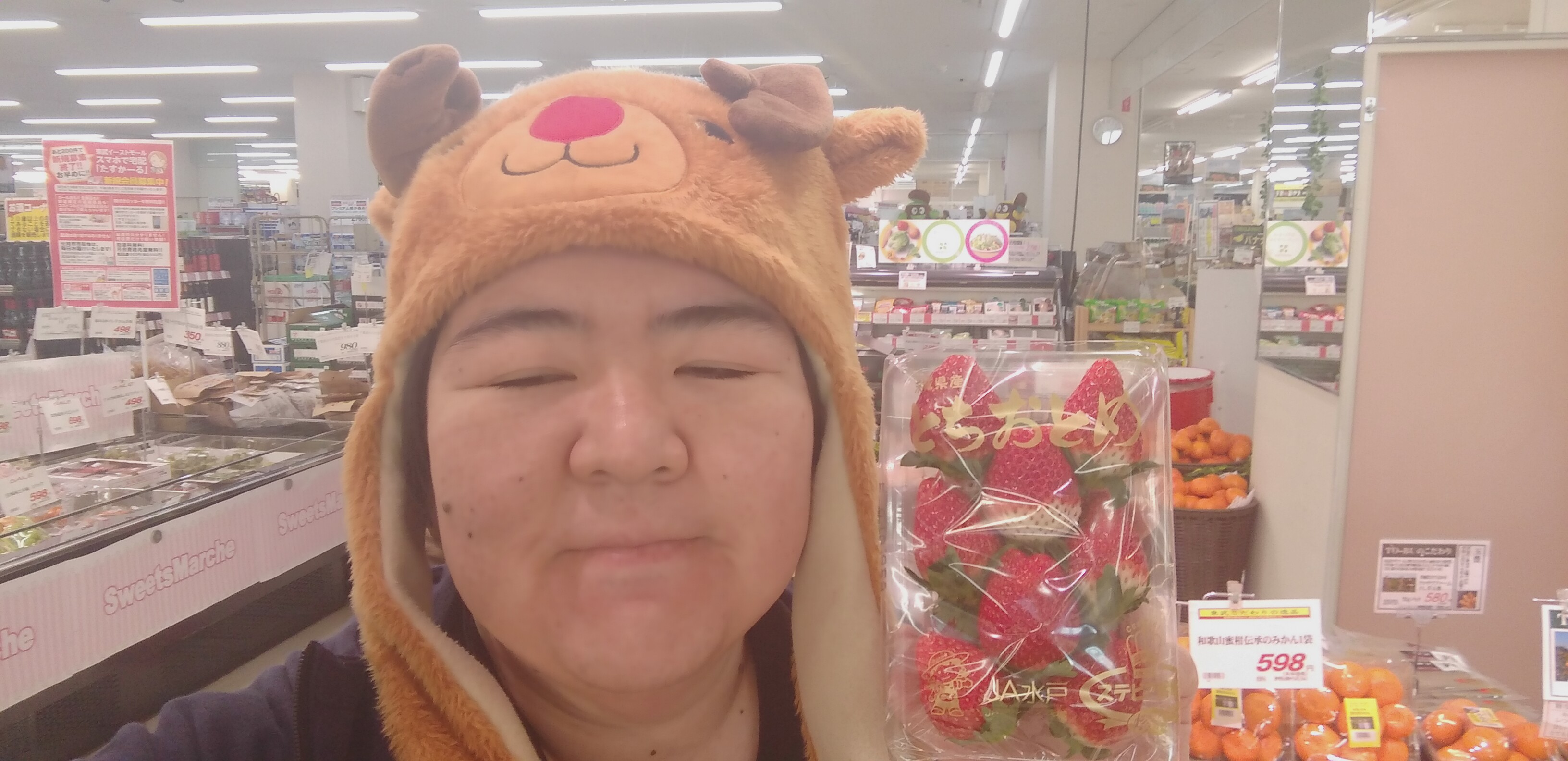おはようございます。青果担当奥瀬です。本日のオススメは、茨城産のいちご。写真はステビア栽培とちおとめ。1パック598円です。茨城産のステビア栽培紅ほっぺいちごも598円です。クリスマスのメニューにいかがでしょうか。是非ご利用くださいませ。皆様のお越しをお待ちしております。