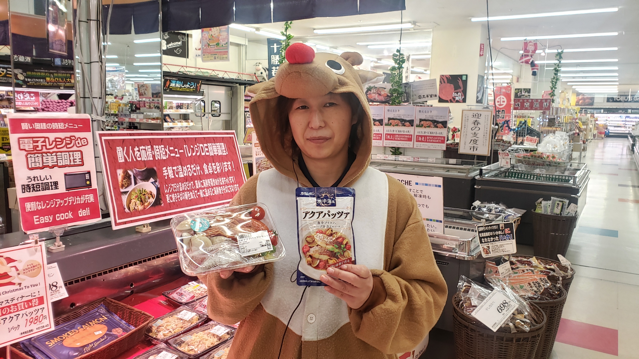 本日の鮮魚コーナーからのおすすめです。 海鮮アクアパッツァセット1パック398円(税抜)となっております。ご家庭で手軽に作れるセットにしました。是非お買い求めお待ちしております。