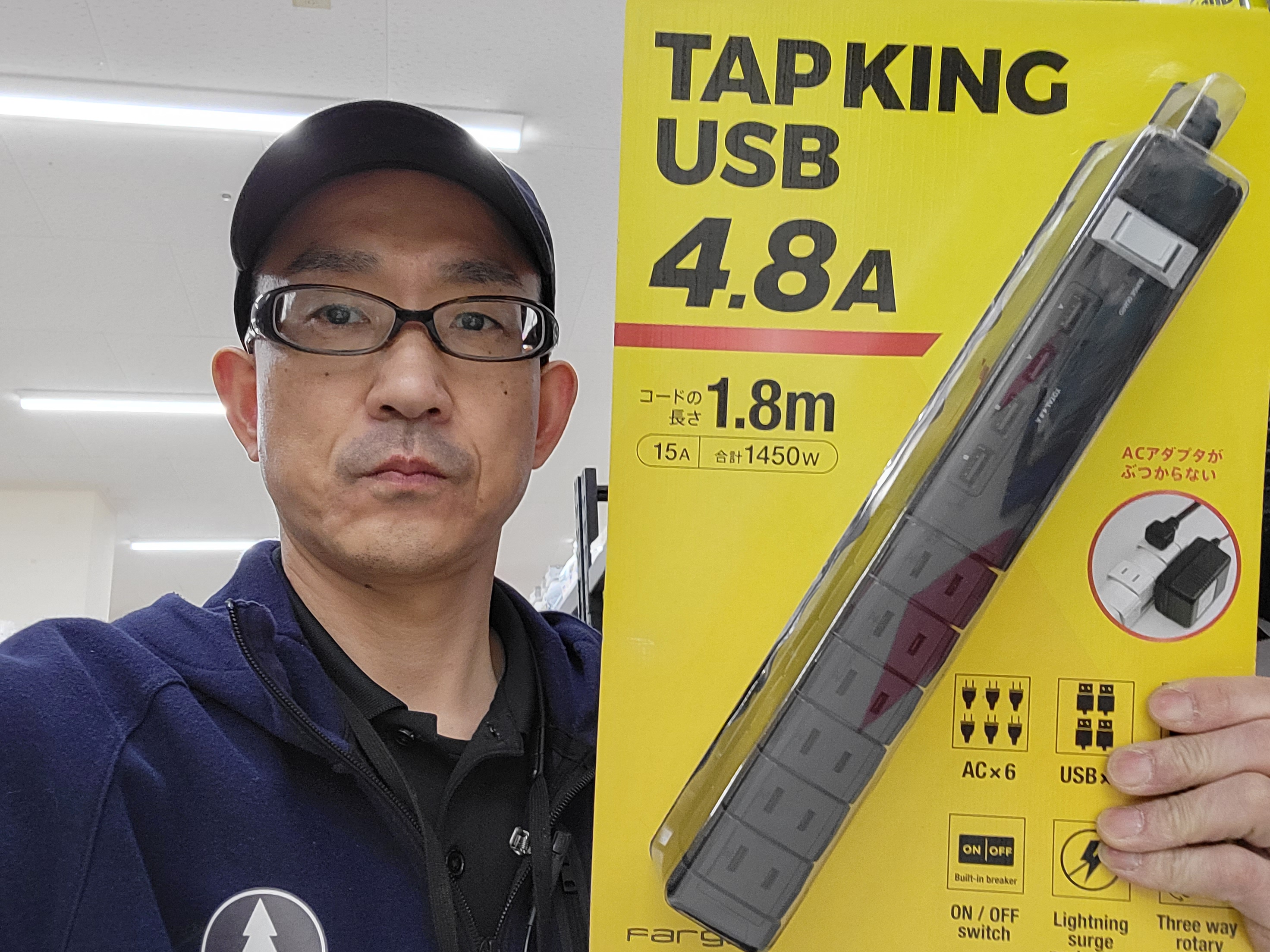 家電コーナーからは、回転AC USBタップです。ACタップ6コ付きでタップが回転するのでぶつからない!USB4コ付きで最大1450W使用出来ますよ。価格は2480円です。是非お買い求めくださいませ。