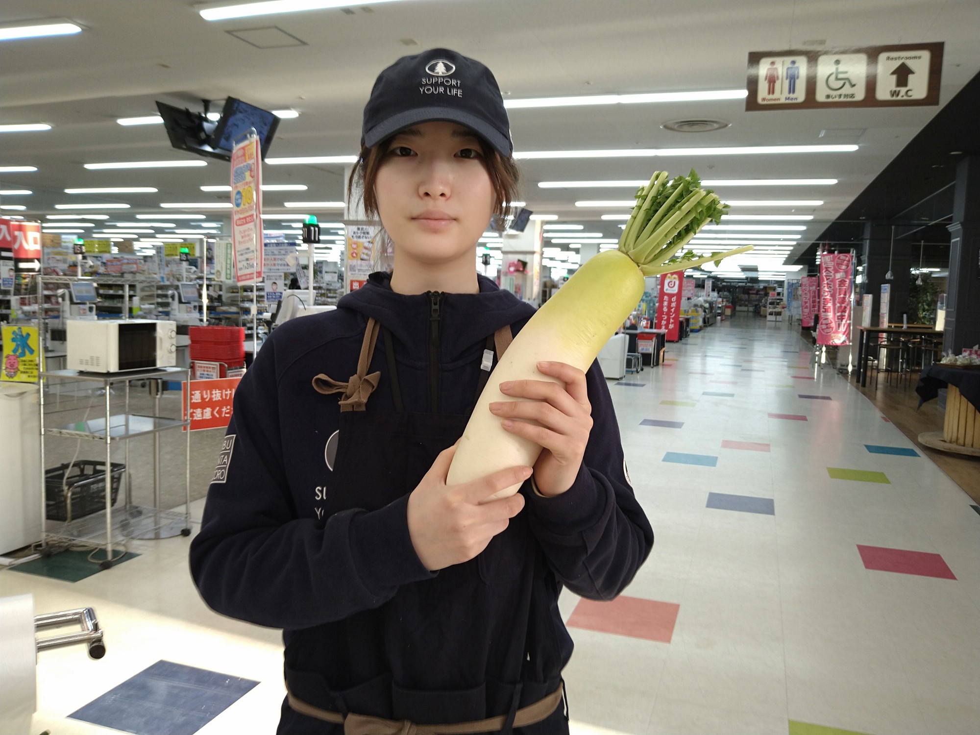 おはようございます。青果コーナーでは、神奈川産大根1本158円(本体価格)にて販売しております。煮物や鍋物にいかがでしょうか。明日1月12日は、悪天候の予報です。今日中にお買い物をお済ませください。