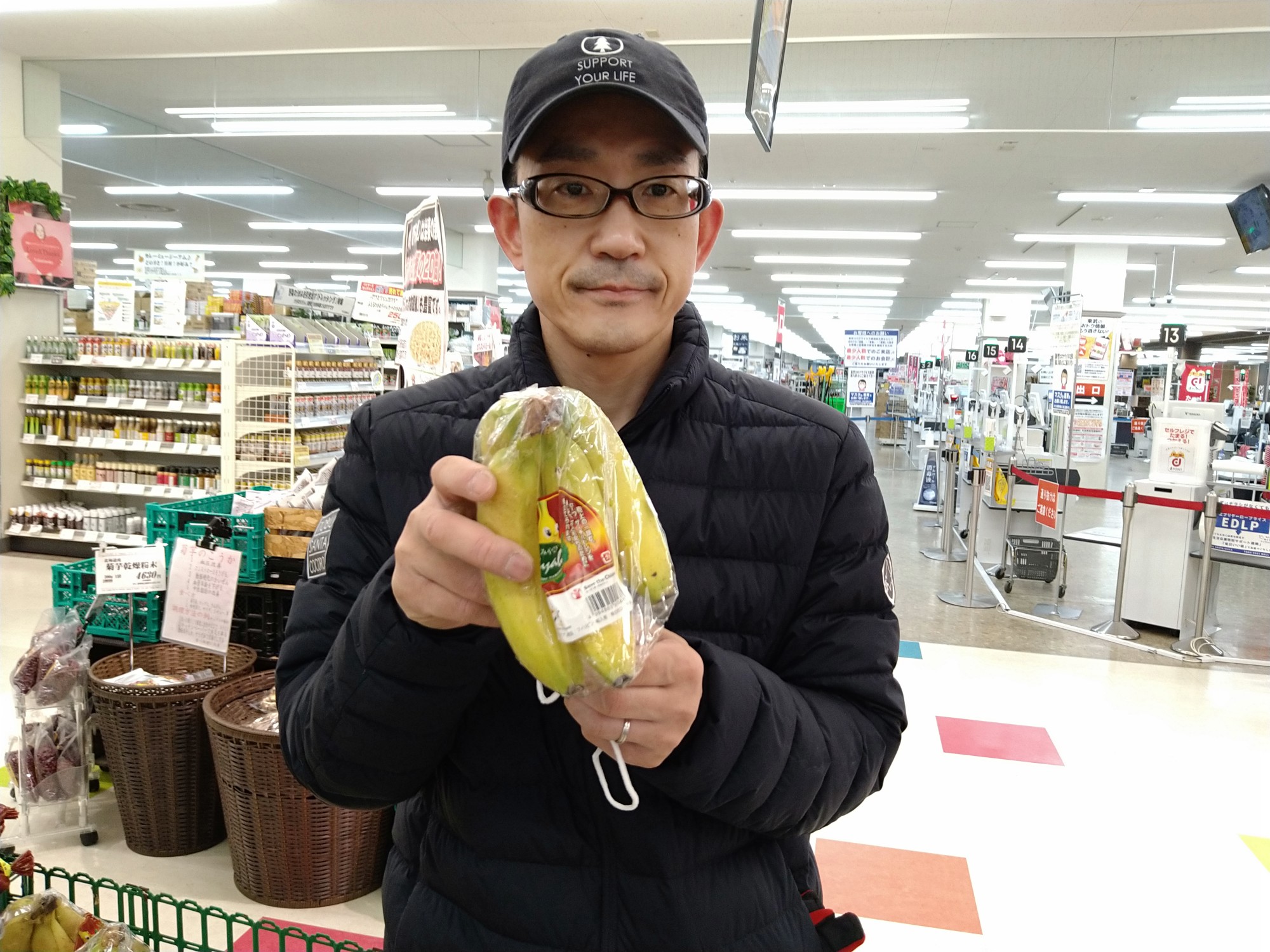 おはようございます。青果コーナーでは、フィリピン産みやびバナナ1袋98円(本体価格)にて販売しております。少し小さく、子供に食べやすい大きさになっております。どうぞ御賞味ください。