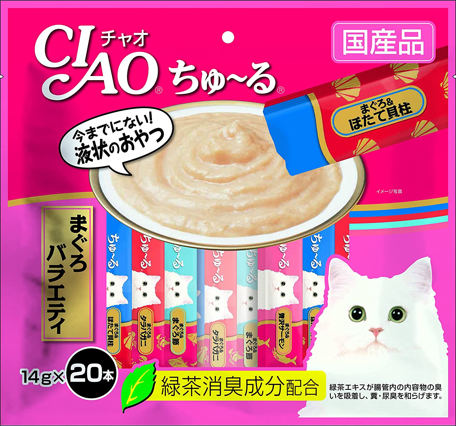 ちゅるっと出して舐めるだけで簡単に水分補給、栄養補給ができる猫用の液状おやつCIAOちゅーる。おやつとして与えたり、普段のごはんに混ぜたり、お薬を服用するときに混ぜたりと、使用用途はいろいろ。4種類の味が入ったバラエティパック。 緑茶消臭成分配合で糞尿のにおいを和らげます。【安心して与えていただくために】●本製品はペット用おやつです。主食として与えないでください。●幼いうちは消化器官が未発達なため、与えないでください。こちらの商品はペットコーナーにて販売中。数量限定特価798円!!