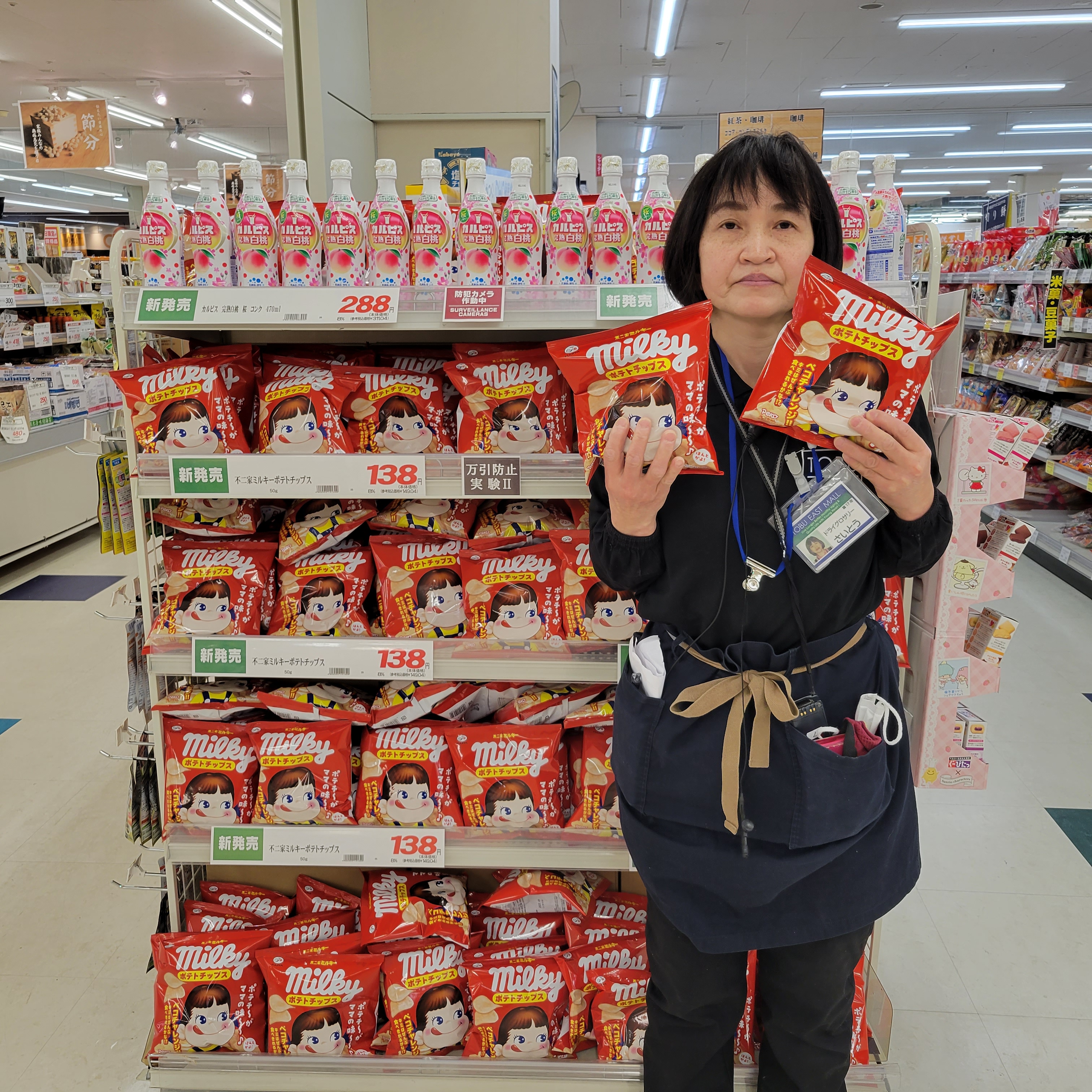 食品コーナーからは、新発売!不二家 ミルキーポテトチップスです。ミルキーをイメージした練乳パウダーを配合しクセになるあまじょっぱさ!価格は50g 入りで138円です。是非お買い求めくださいませ。