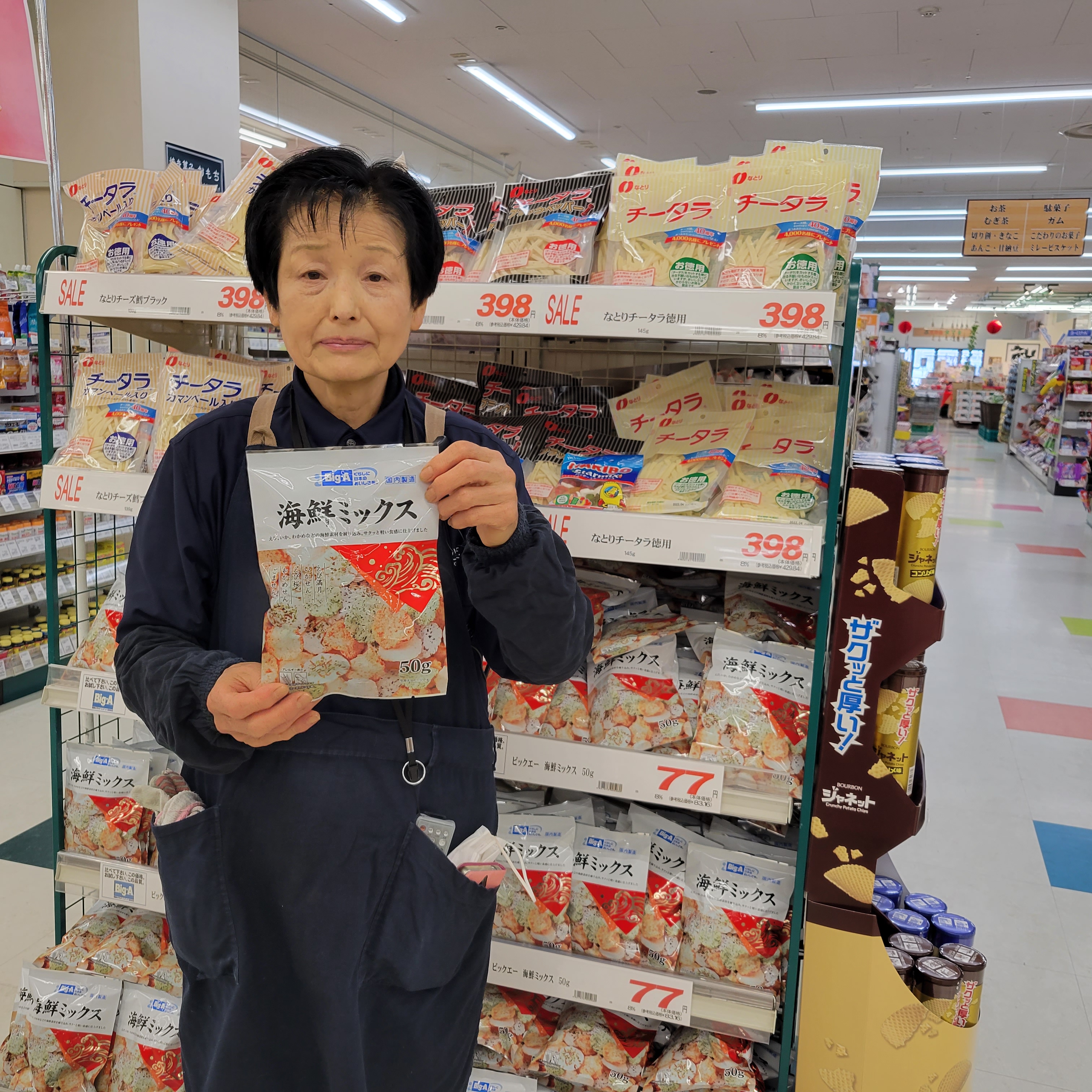 食品コーナーからは、、人気のビッグ・エーから、 海鮮ミックスです。えび、いか、わかめなどの海鮮素材を練り込み、サクッと軽い食感に仕上げました。価格は50g入りで77円です。是非お買い求めくださいませ。