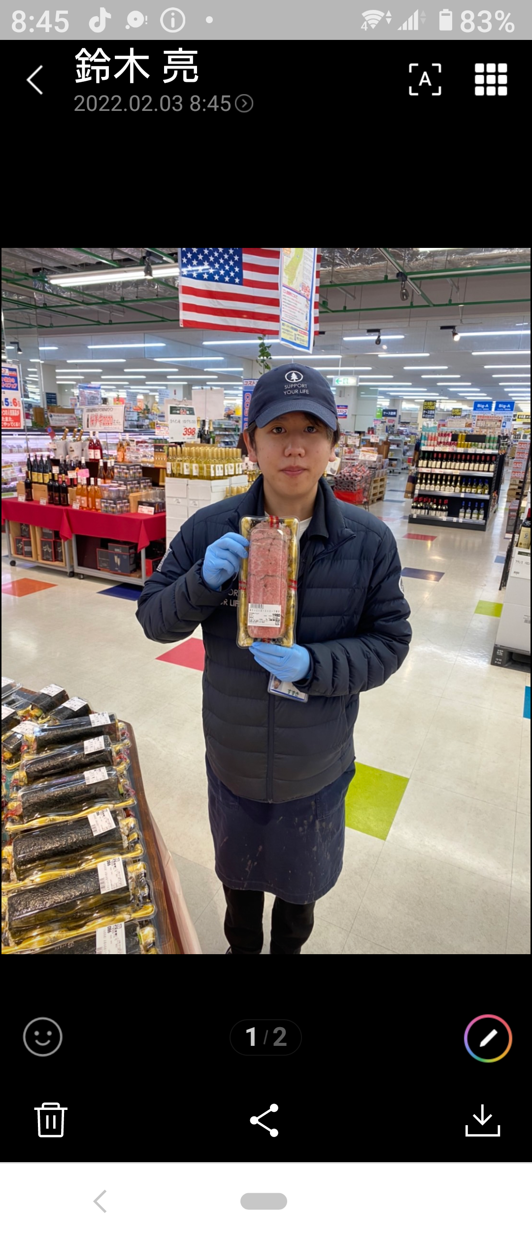 おはようございます。ミート担当鈴木です 。本日は年に一度の節分の日です。今年の方角は北北西です。家族みんなの無病息災を願う日でもあります。ミートコーナーのおすすめは超たっぷりローストビーフ巻きです。和牛のローストビーフを大胆に使用しました。その他にも多数ございます。ご来店お待ちしております。