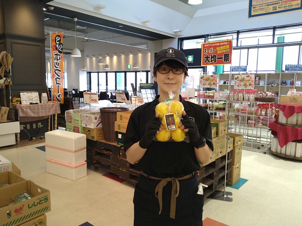 おはようございます。青果コーナーでは、広島産西日光農園のはるか1袋498円(本体価格)にて販売しております。見た目はレモンのようですが、とても甘く、糖度が約13度あります。これは甘いスイカくらいあります。どうぞ御賞味ください。