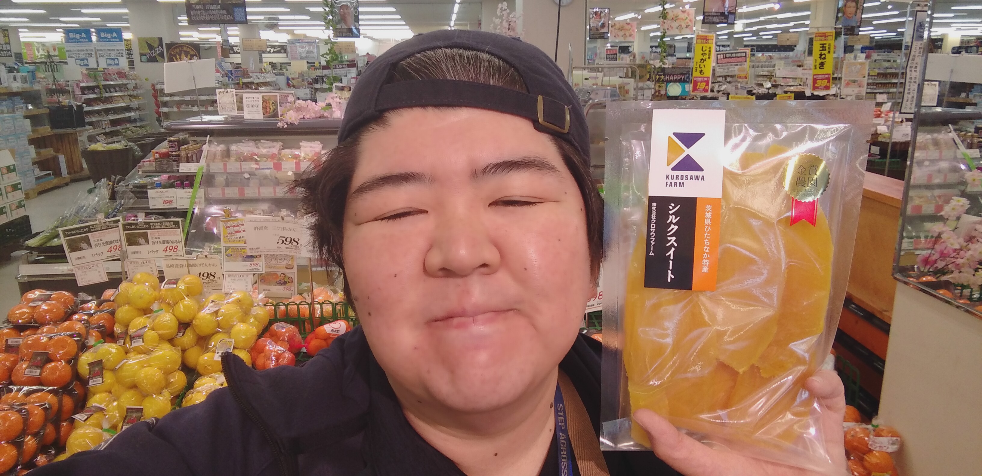 おはようございます。青果担当奥瀬です。本日のオススメは、茨城県ひたちなか市のクロサワファームの干し芋です。写真はシルクスイート。しっとり柔らかなこだわりの干し芋。是非ご賞味ください。1パック200g入りで580円です。