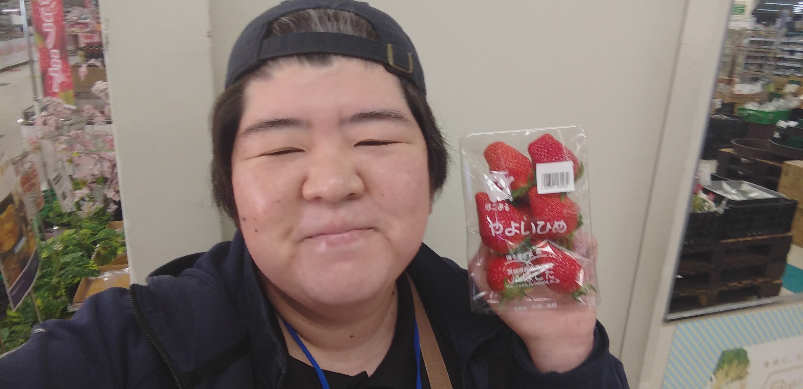 おはようございます。青果担当奥瀬です。本日のオススメは、茨城産のいちごです。写真はやよいひめ。香りが高く、甘くて美味しいいちごです。1パック598円です。この他にもとちおとめ、べにほっぺ、いばらキッス、バインベリー等とりそろえております。是非ご利用くださいませ。