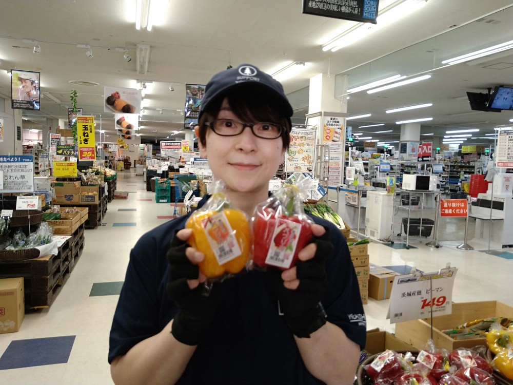 おはようございます。青果コーナーでは、宮崎産須川さんのパプリカ(赤・黄)1玉298円(本体価格)にて販売しております。サラダや炒め物などにどうぞ御賞味ください。