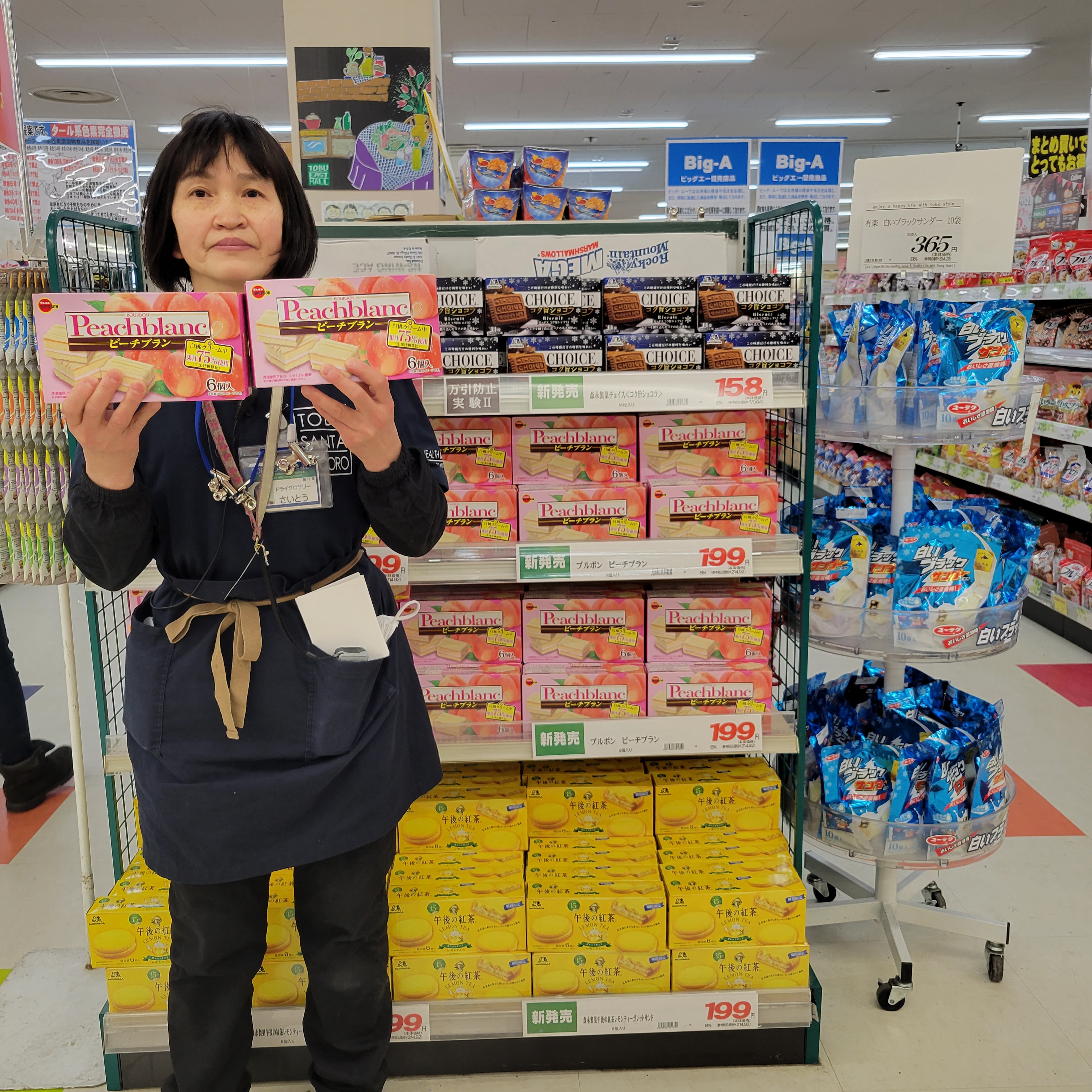 食品コーナーからは、ブルボン ピーチブラウンです。白桃クリーム中果汁75%使用で桃感バッチリでふんわりやわらか!価格は6コ入りで199円です。是非お買い求めくださいませ。