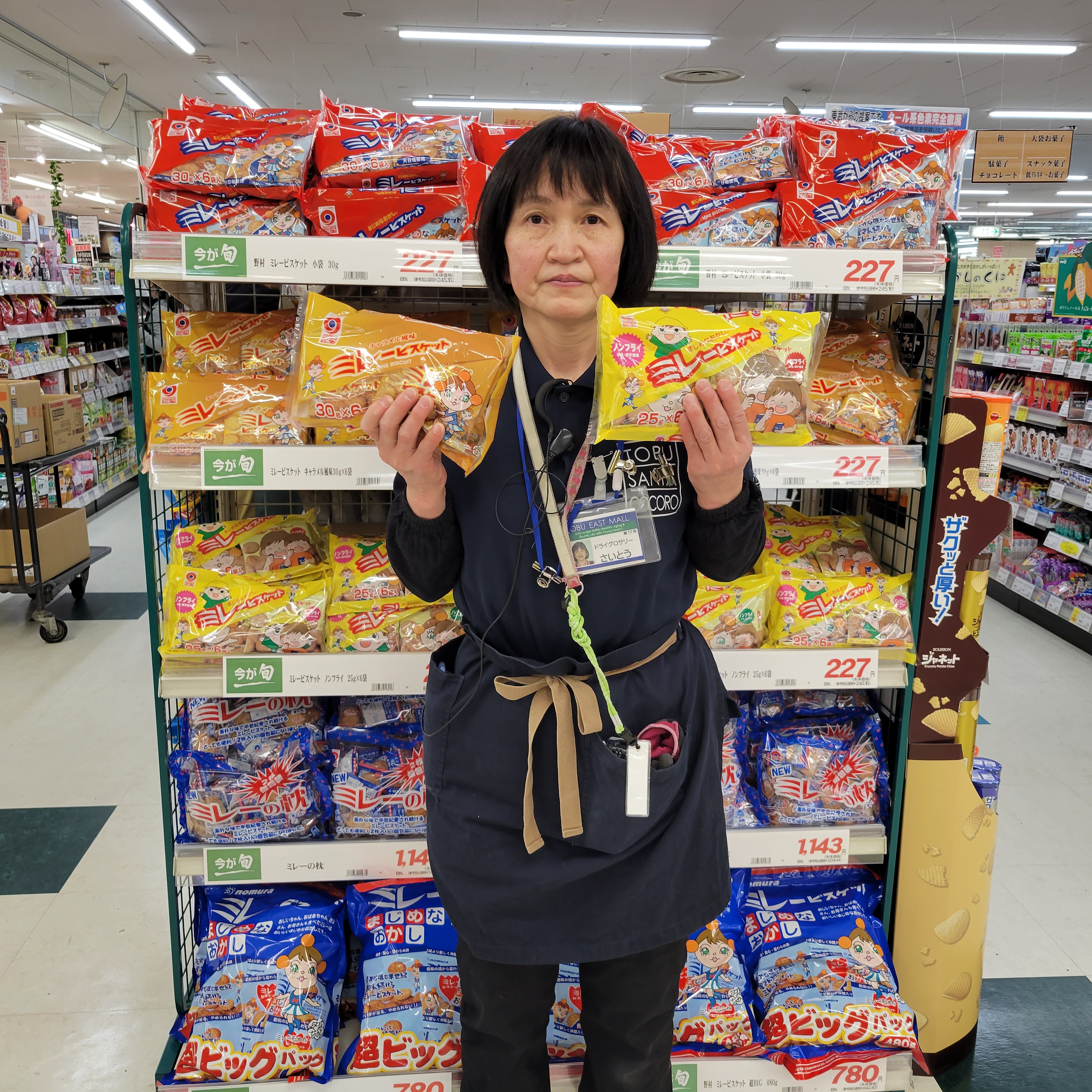 食品コーナ-からは、のむら ミレービスケット キャラメル風味30g×6袋入りとノンフライ(牛乳・卵不使用)25g×6袋入りです。価格はどちらも277円です。是非お買い求めくださいませ。