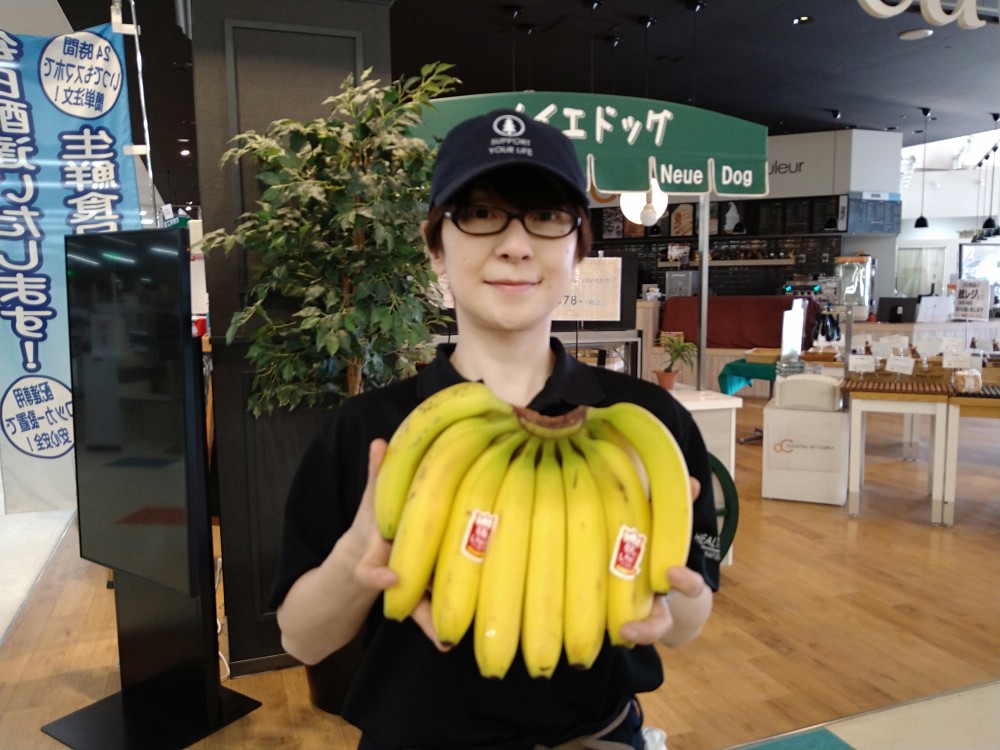 おはようございます。青果コーナーでは、フィリピン産大房バナナ1房350円(本体価格)にて販売しております。ホットケーキやバナナジュースなどにしても美味しく召し上がれます。どうぞ御賞味ください。