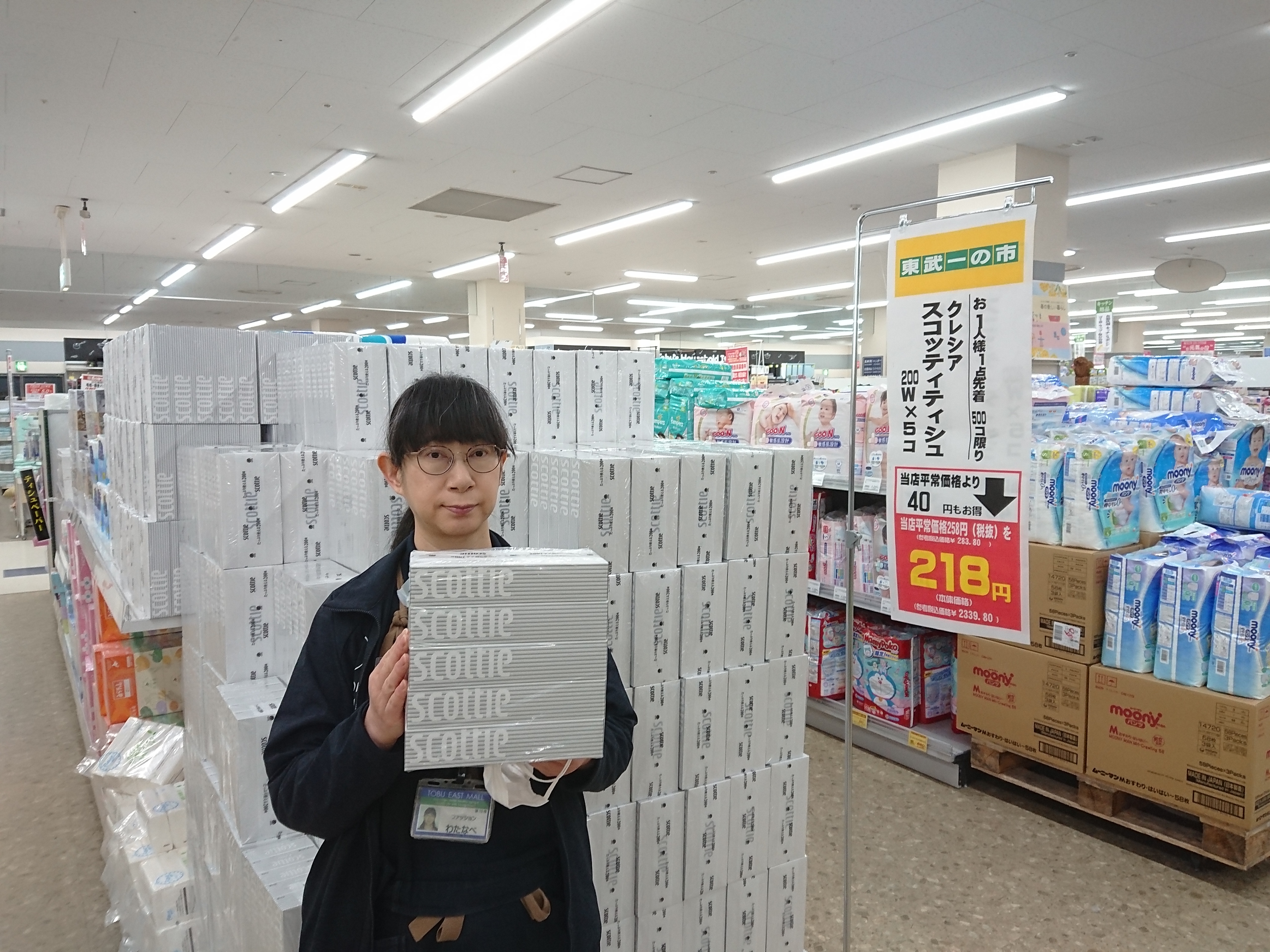 おはようございます、本日は日曜東武一の市!お一人様1点先着500個限りスコッテイ ボックスティッシュ5個入お買い得です!