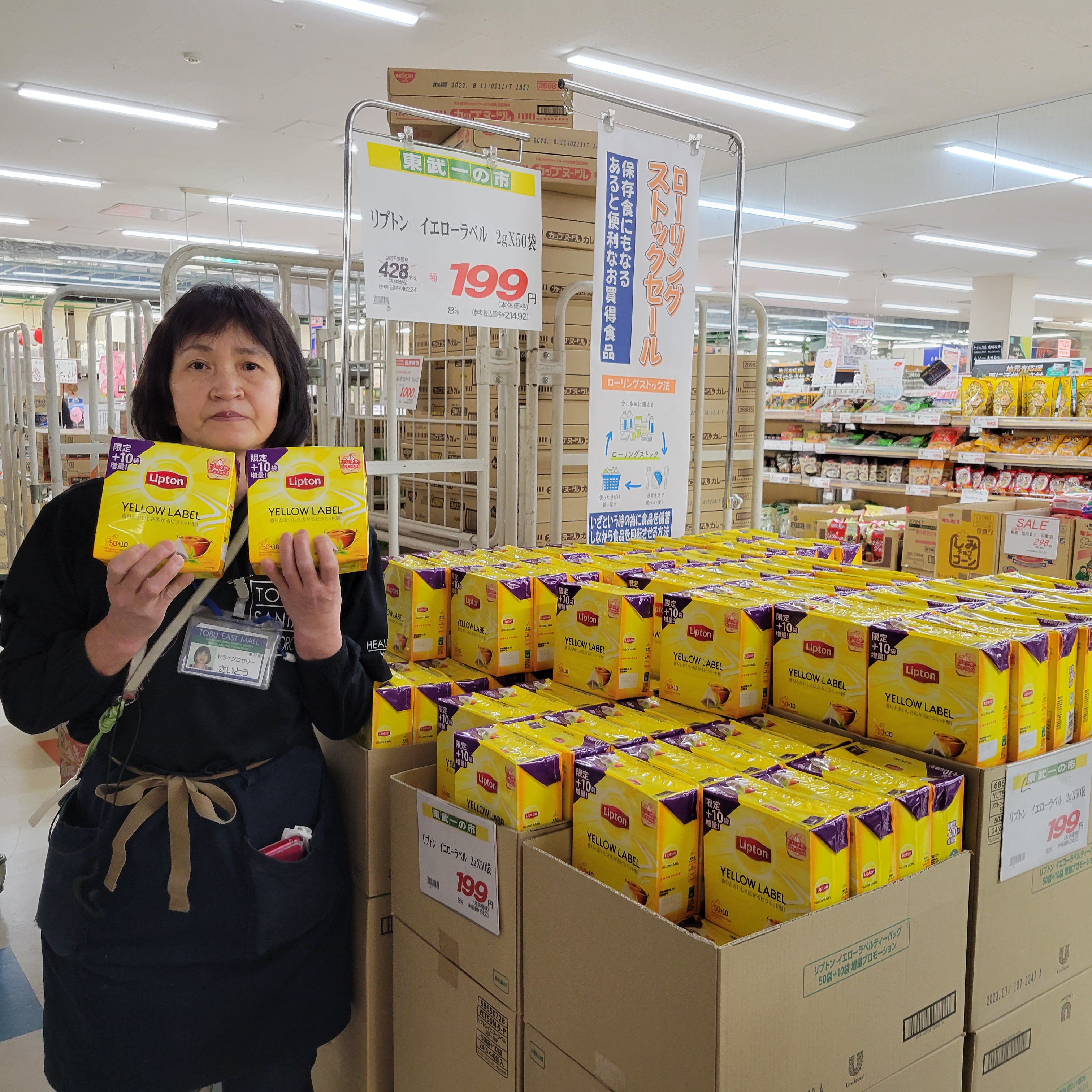 食品コーナーからは、本日、特別一の市開催!リプトン イエローラベルです。限定10P増量で60パック入りで199円です。是非お買い求めくださいませ。