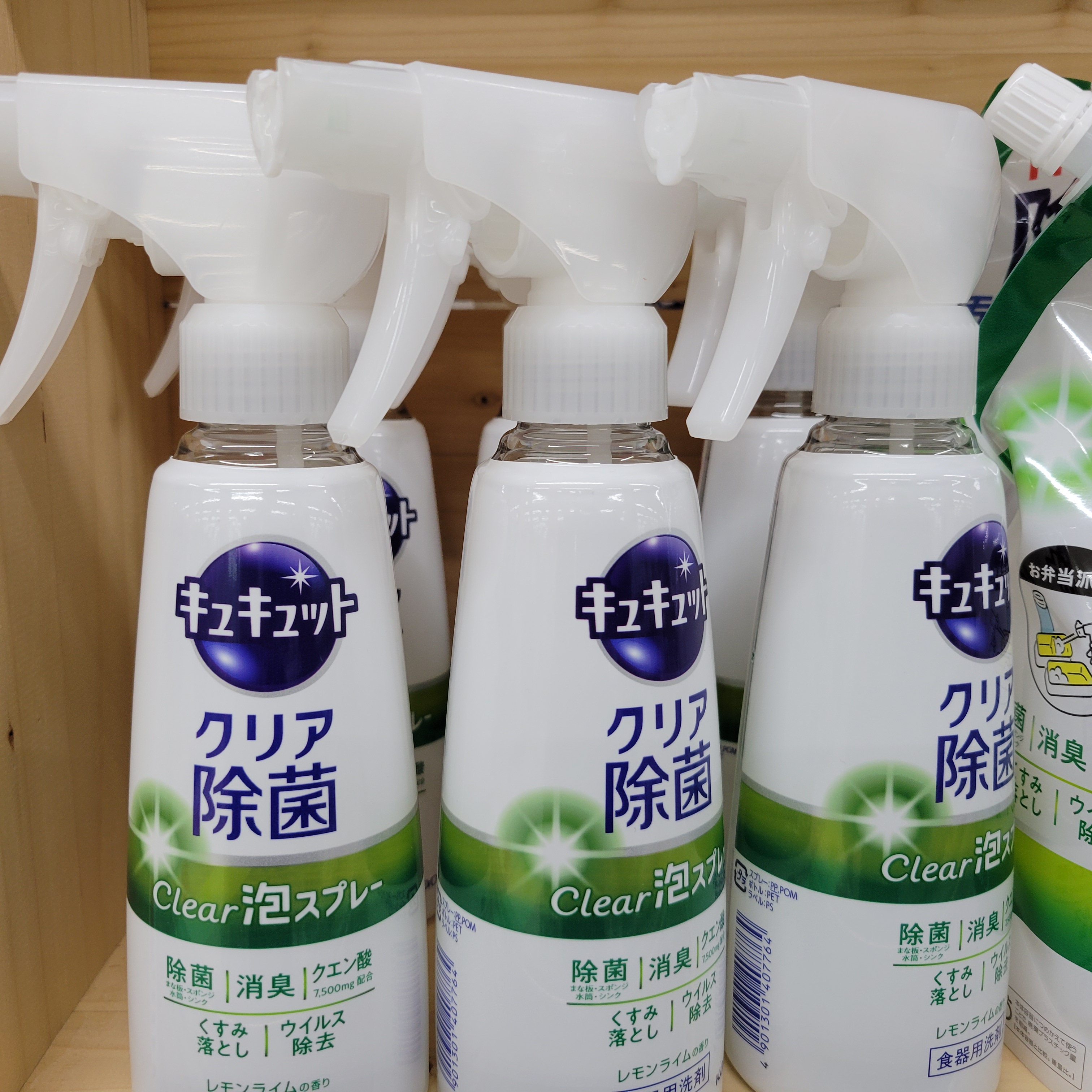 食品コーナーからは、本日、特別一の市開催!花王キュキッュト クリア除菌クリア泡スプレー本体です。価格は300ml入りで198円です。是非お買い求めくださいませ。