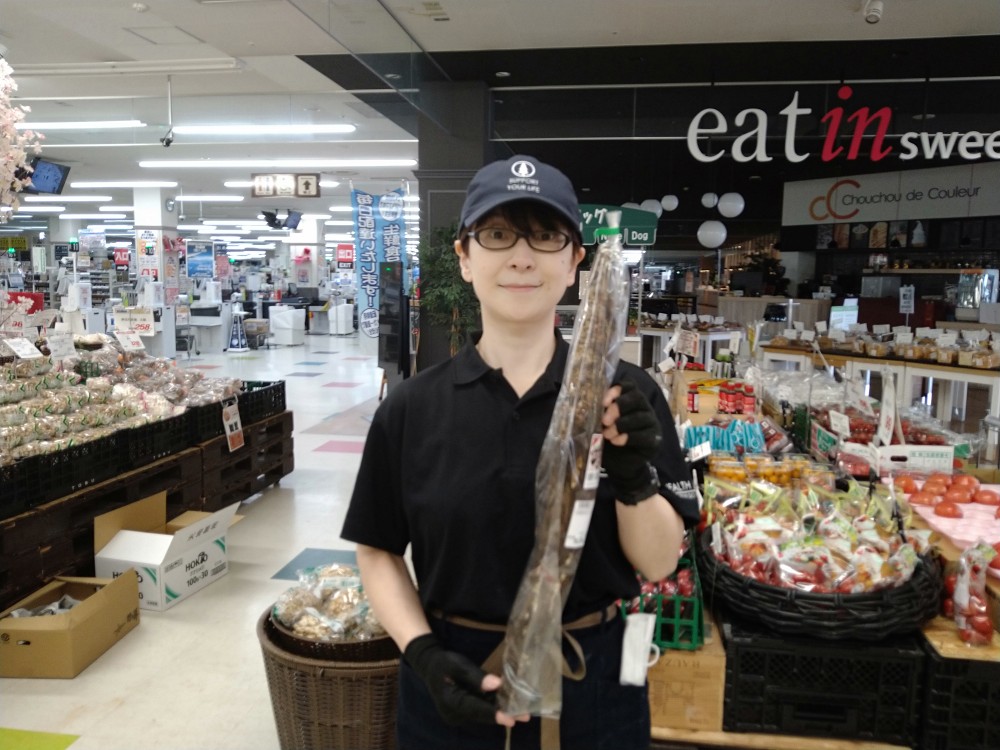 おはようございます。青果コーナーでは、北海道産和田さんの太すぎるごぼう100g当たり35円(本体価格)にて販売しております。太さも味も最大級。大きくても、柔らかくて上品な香り。ぜひ御賞味ください。