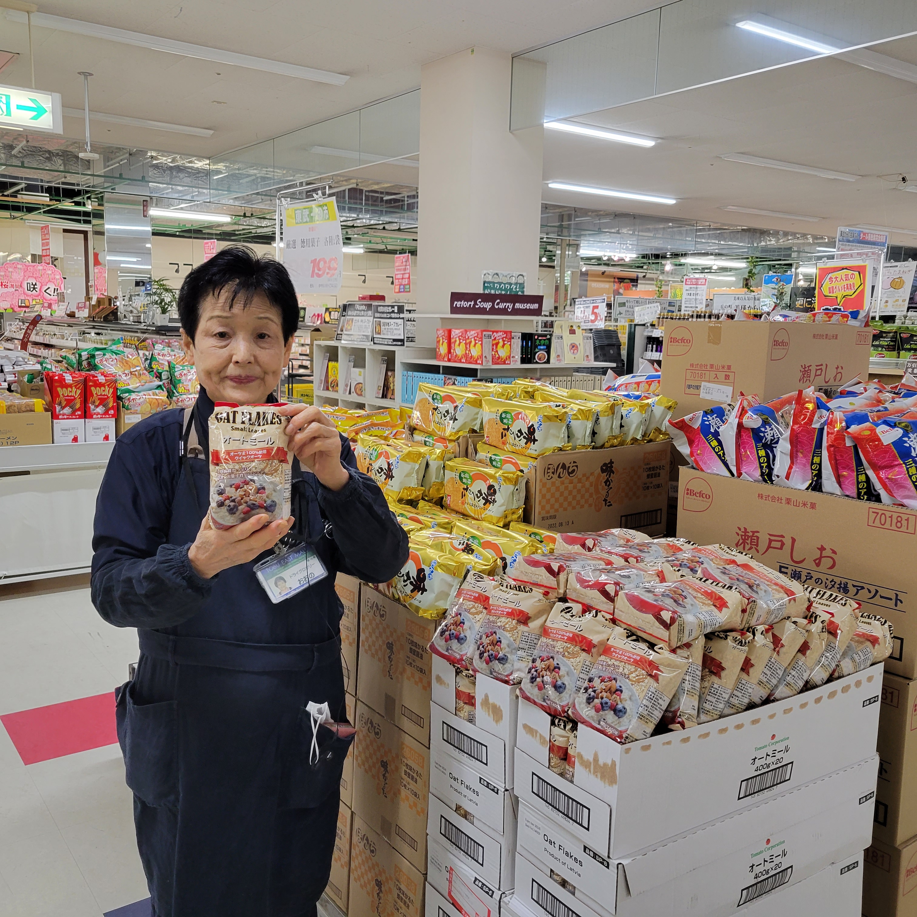 食品コーナーからは!本日一の市!徳用菓子がお買得です!価格は1袋199円です!是非お買い求めくださいませ。