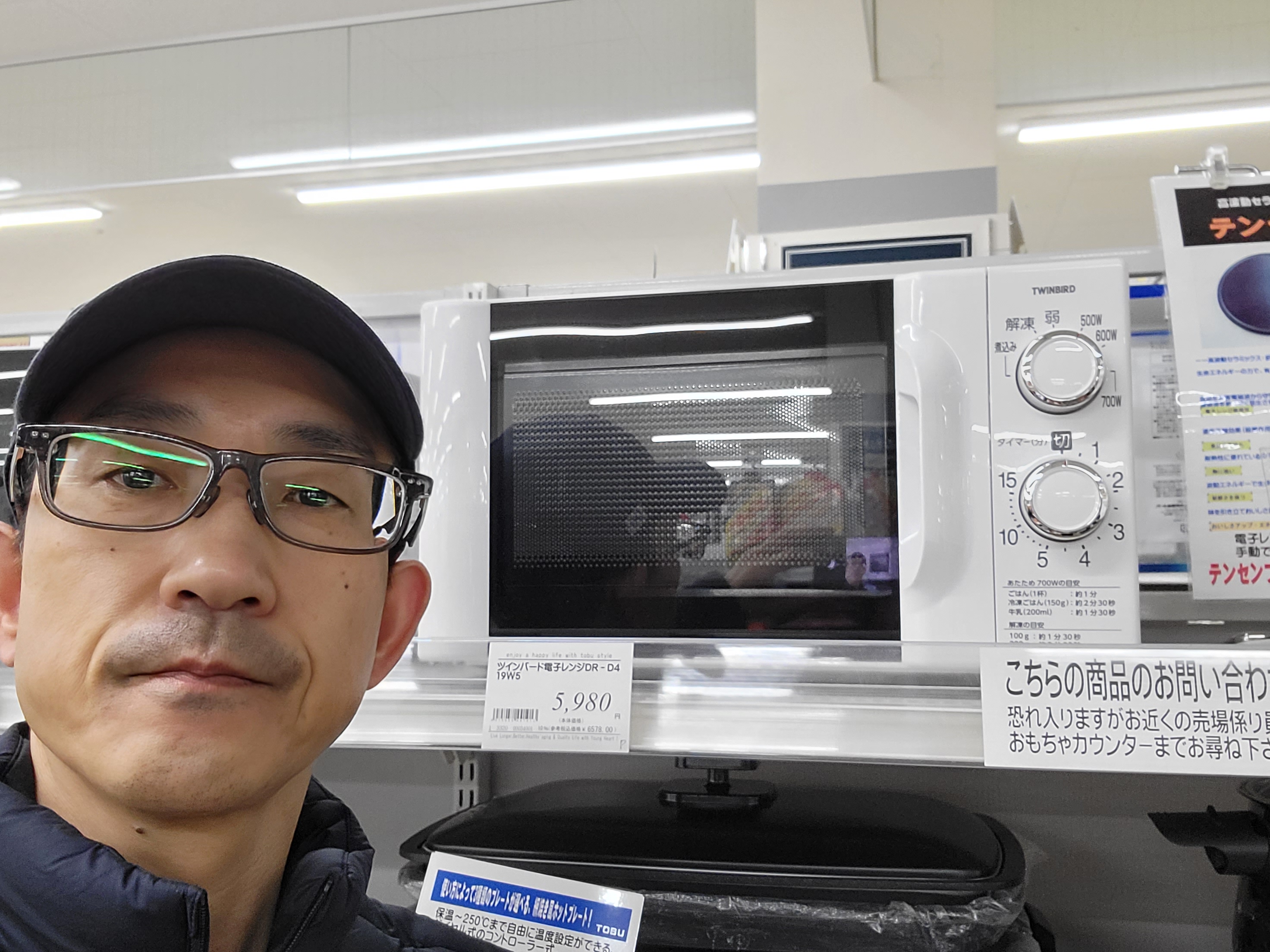 家電コーナーからは、おすすめ!TWINBIRD 電子レンジ 700Wです。よく使う5分以下を細かく調整しやすい15分タイマーです。価格は5980円です。是非お買い求めくださいませ。