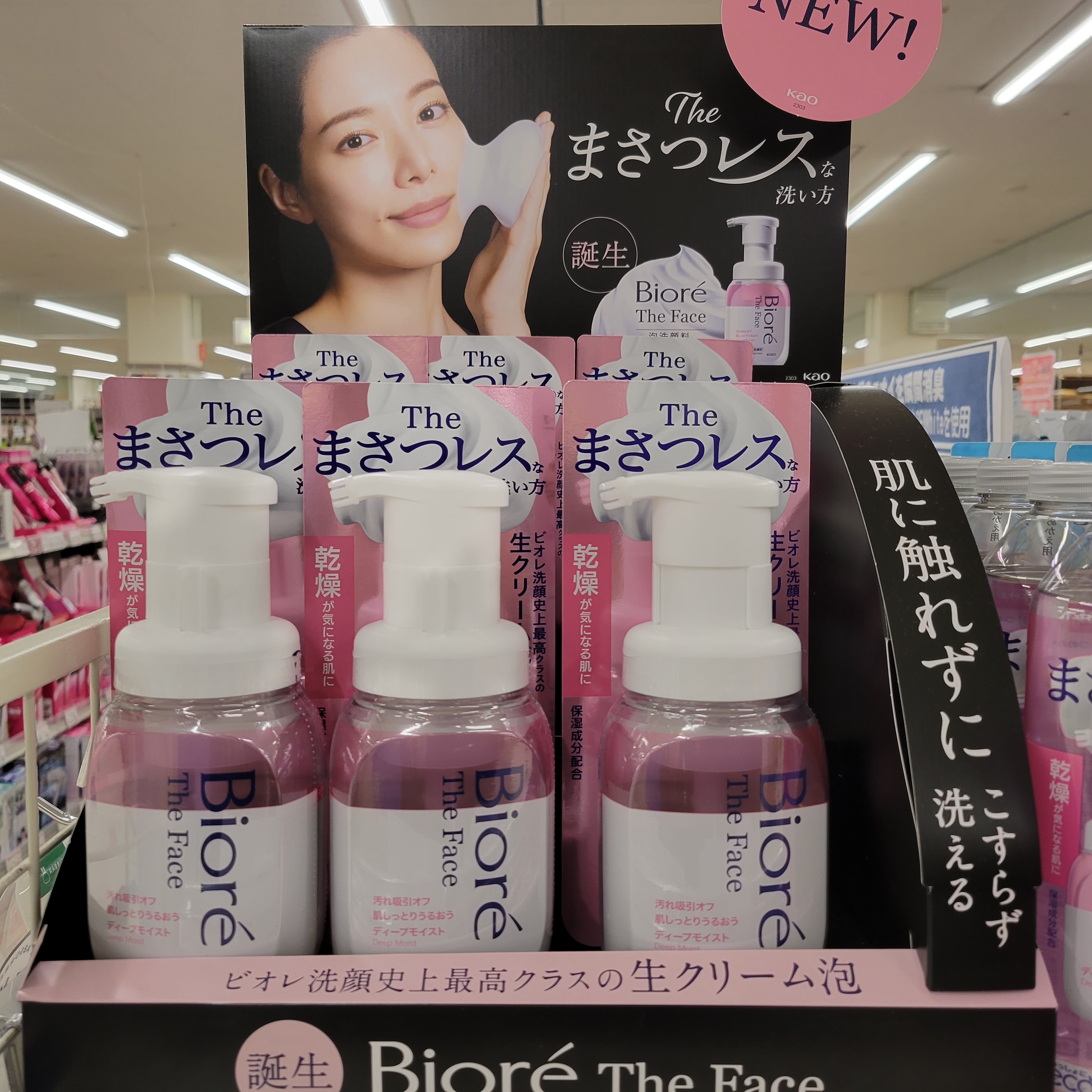 消耗品コーナーからは、肌に触れずに洗顔!まさつレス!ビオレ ザフェイス泡洗顔ディープモイス本体です。価格は750円です。是非お買い求めくださいませ。
