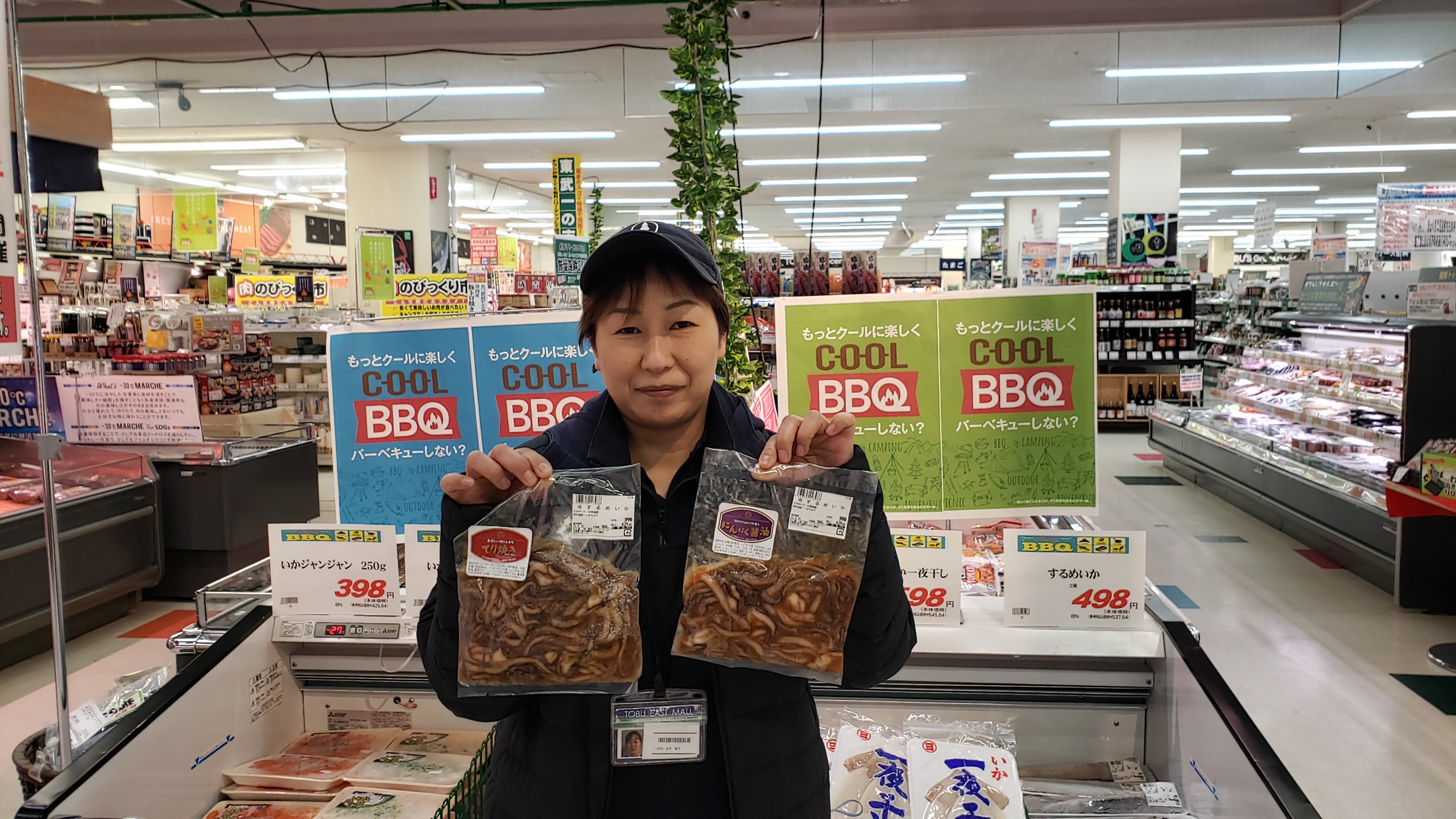 本日の鮮魚コーナーからのおすすめです。冷凍するめいか(下足)味付け300g入り398円(税抜き)となっております。是非バーベキューのお供にいかがでしょうか!是非ご来店お待ちしております。