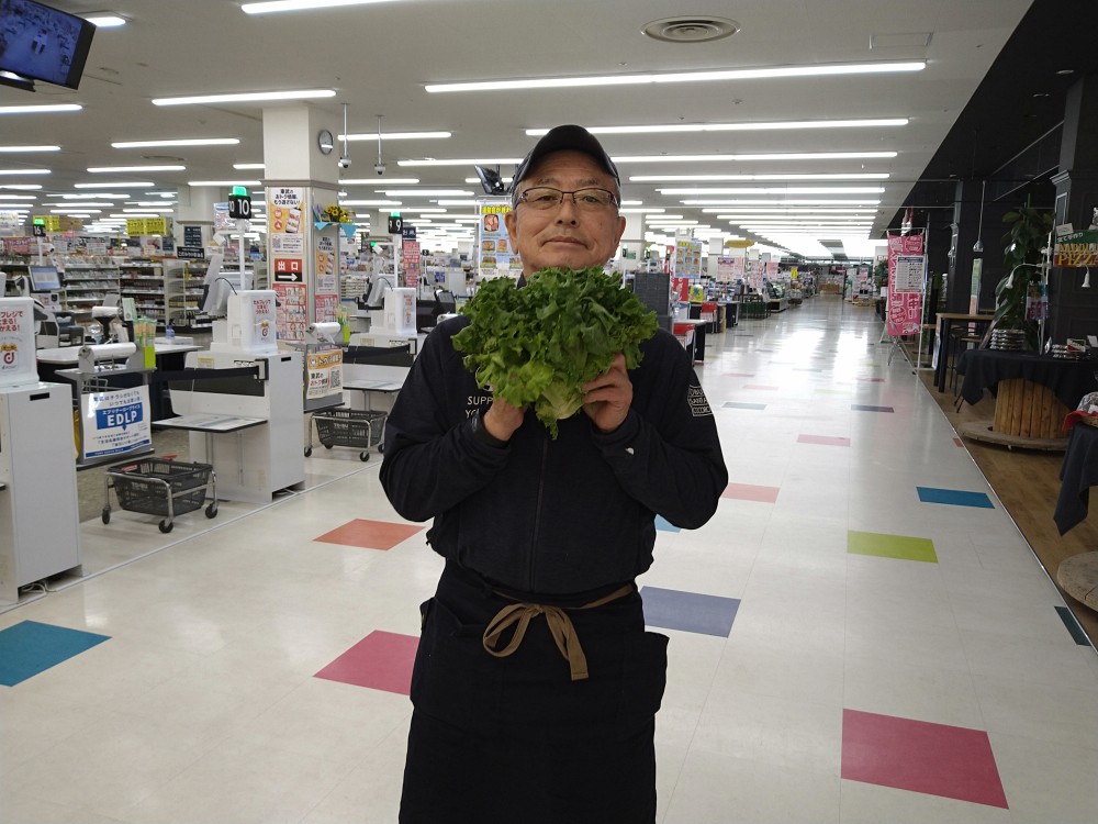 おはようございます。青果コーナーでは、北見産グリーンレタス1玉99円(本体価格)にて販売しております。サラダや焼肉などにどうぞお召し上がりください。