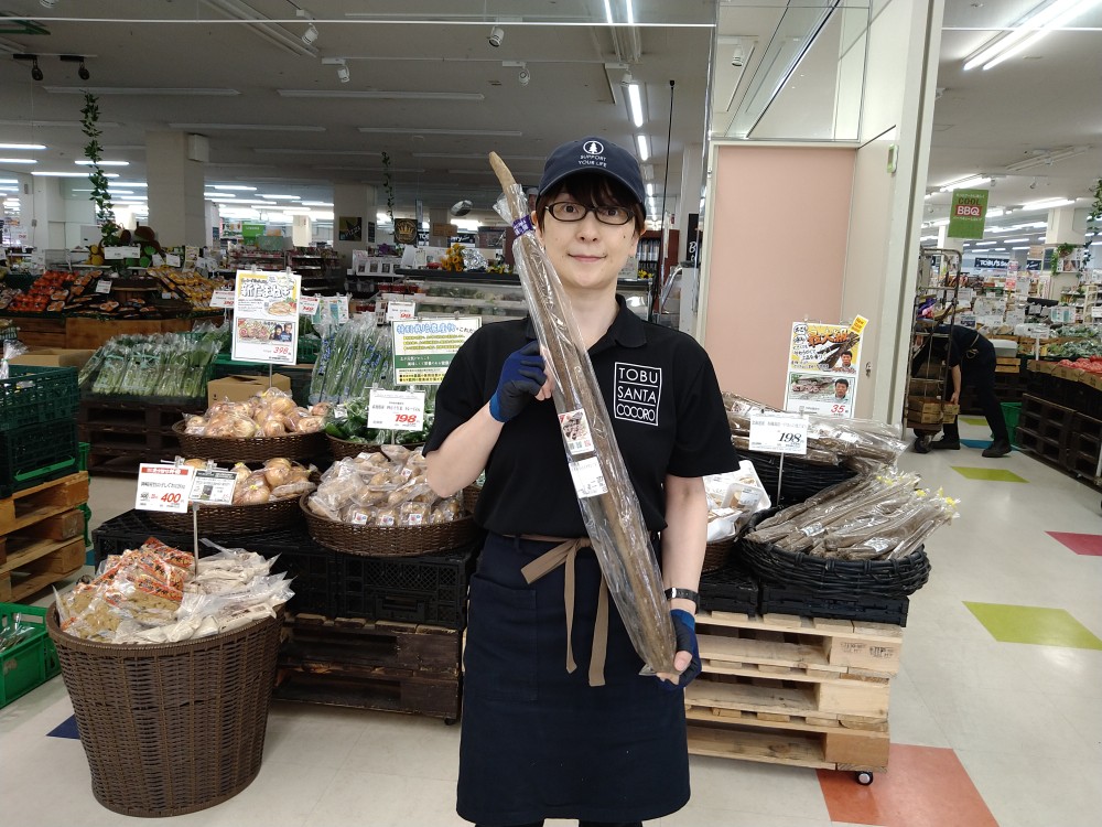 おはようございます。青果コーナーでは、北海道産和田さんの太すぎるごぼう100g当たり35円(本体価格)にて販売しております。天ぷらや、中をくり抜き肉詰めなどにいかがですか?どうぞ御賞味ください。